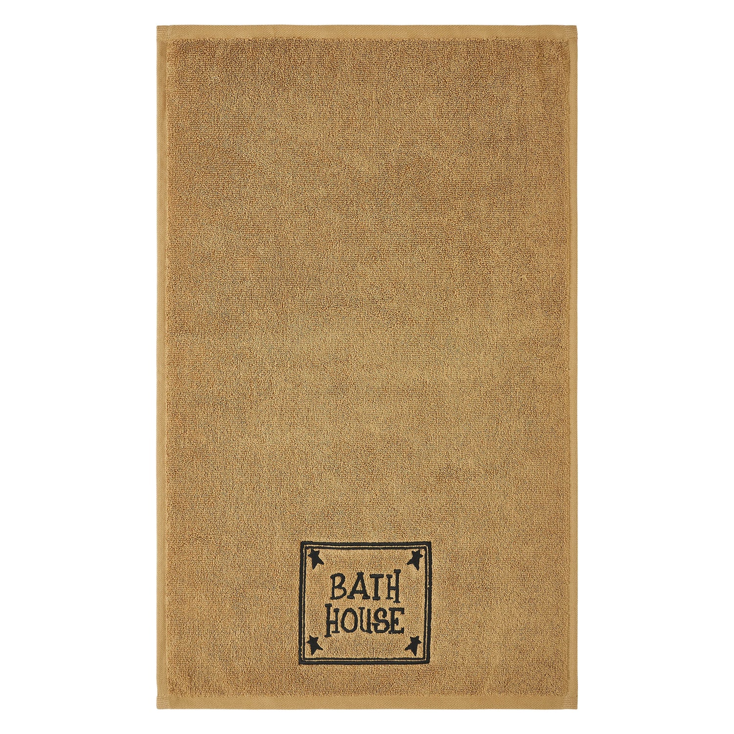 Add a touch of rustic charm to your bathroom with the VHC Brands Bath House Prim Stars Tan Hand Towel Set of 2. Crafted from thick and plush terrycloth, these cotton hand towels are both soft and absorbent, providing a cozy and functional addition to your daily routine. The warm doe tan hue of the towels serves as a perfect backdrop for their intricate embroidered design, adding a decorative touch that enhances any country washroom or farmhouse-inspired space. At the bottom of each hand towel, you'll find primitive stars delicately embroidered in each corner, surrounding a framed quote that reads Bath House in a bold rich black color. This thoughtful design not only adds visual interest but also reflects a timeless rustic aesthetic that complements a variety of bathroom styles. Whether displayed for decorative purposes or used for daily drying, these towels bring a cozy, lived-in feel to your home. Measuring 16x26 inches, the VHC Brands Bath House Prim Stars Hand Towel Set is the perfect size for hanging near the sink or on a towel rack. These machine-washable towels are easy to care for, making them a practical choice for families and frequent use. Elevate the look and feel of your bathroom with this beautifully crafted towel set that combines functionality with primitive country style.