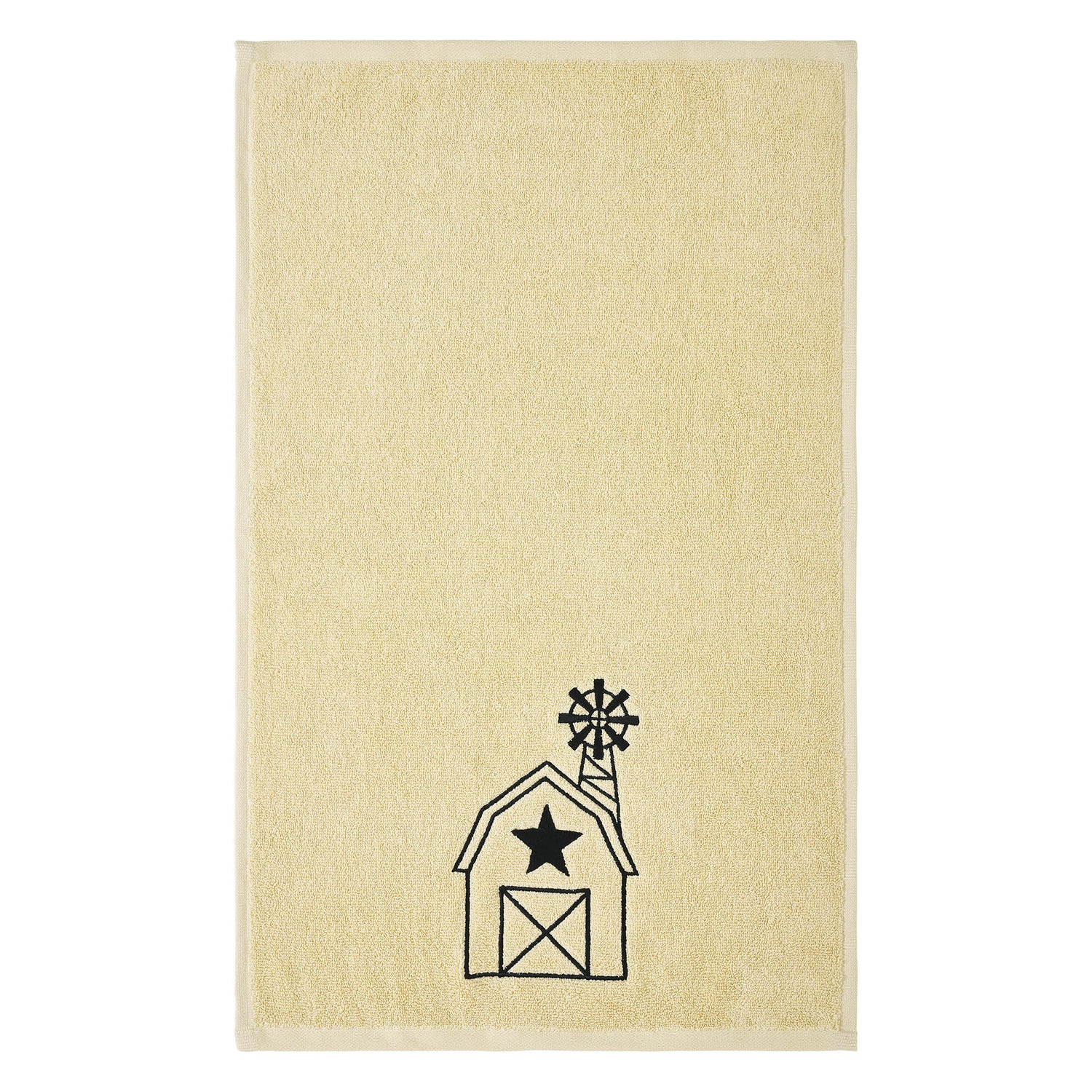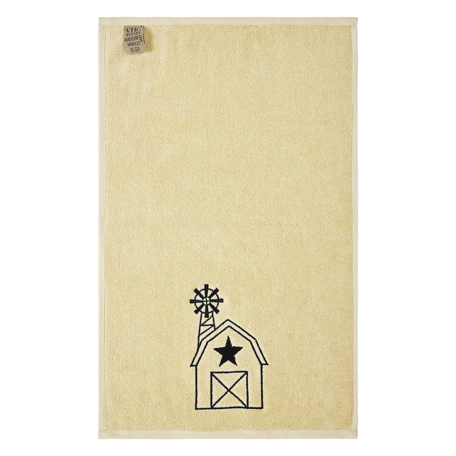 Add a touch of rustic charm to your bathroom with the VHC Brands Black Barn w/ Mill Creme Hand Towel Set of 2. Crafted from soft and absorbent cotton terrycloth, these towels are both functional and decorative. The neutral soybean creme color provides a warm, versatile base, while the detailed embroidered design at the bottom features a charming barn with a 5-point star and windmill, stitched in country black, enhancing the farmhouse aesthetic. Each hand towel measures 16x26 inches, making them the perfect size for everyday use in your bathroom. The embroidered barn and windmill design evoke a cozy, homestead feel that complements country, rustic, or farmhouse decor. These towels are not only visually appealing but also practical, being machine washable for easy care and long-lasting use. The VHC Brands Black Barn w/ Mill Creme Hand Towel Set combines rustic elegance with everyday functionality. Perfect for adding a homestead touch to your bathroom, these towels provide a cozy, farmhouse vibe while serving as a practical necessity in your space. Ideal for those who love blending style with utility in their home decor.