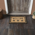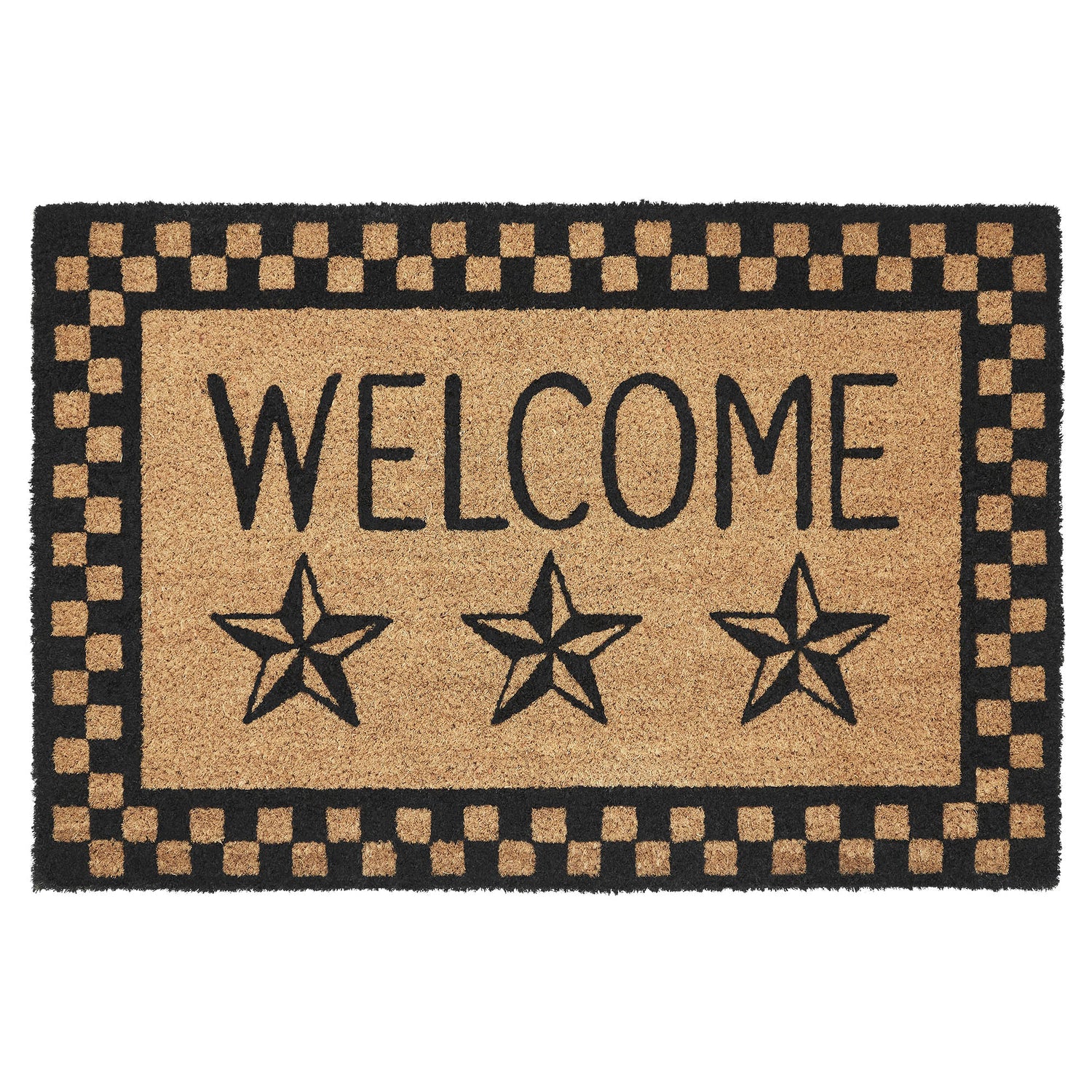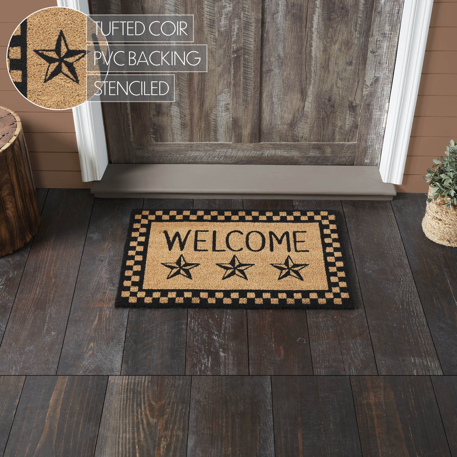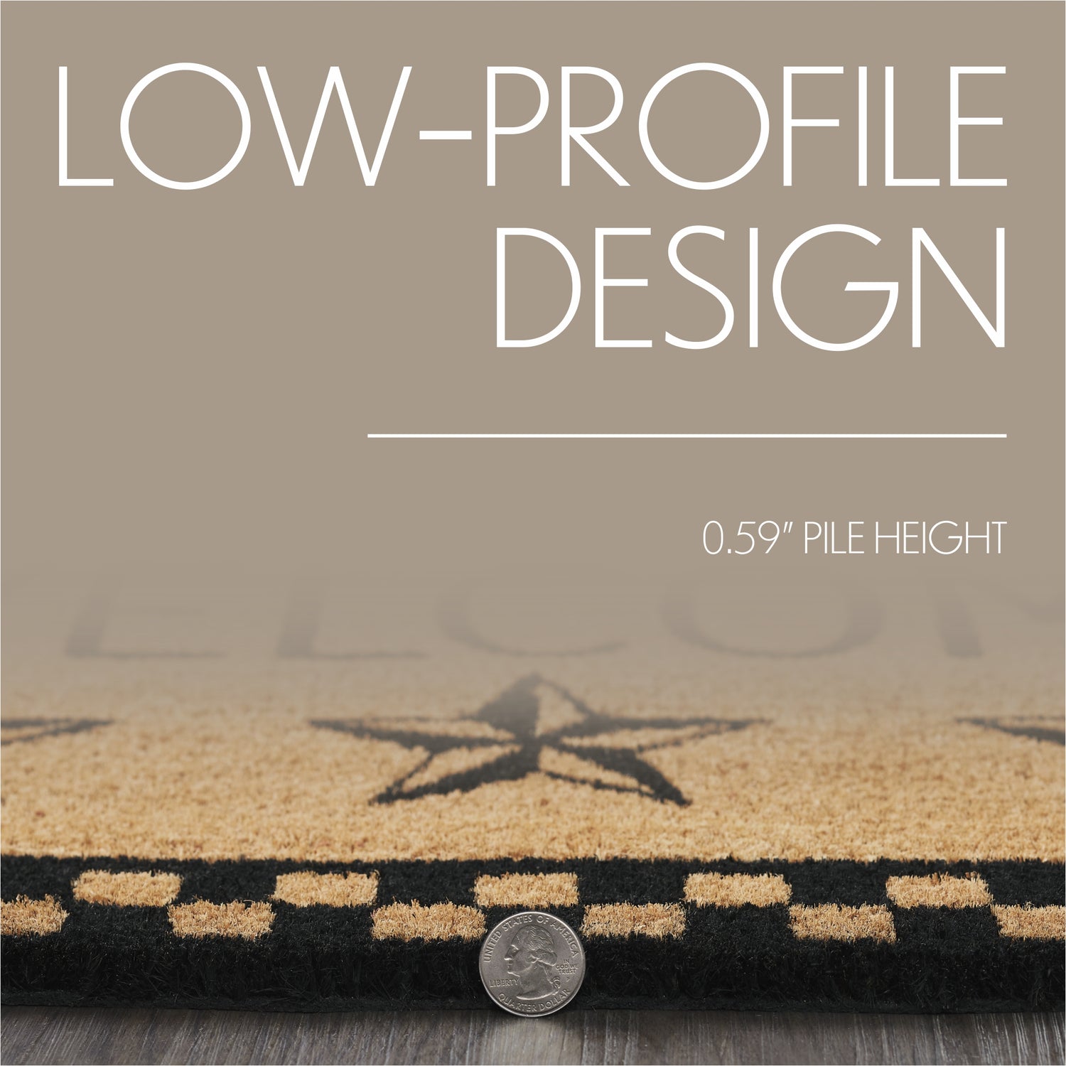 Welcome your guests with the inviting charm of the VHC Brands Black Check Stars Coir Welcome Rug Rect 20x30. This beautifully crafted doormat showcases a prominent Welcome message adorned with rustic barn star accents. Framed by a classic black checkered design on a natural tan background, this rug adds a touch of traditional farmhouse style to your entryway. Made from durable coir, this rug is designed to effectively trap dirt and debris, ensuring your entryway stays clean and welcoming. The rectangular shape fits snugly at your doorstep, while the non-slip PVC backing provides stability, preventing slips and keeping the mat securely in place even in high-traffic areas. The combination of checks and stars creates a warm and inviting atmosphere that resonates with rustic charm. For easy maintenance, simply shake or vacuum the rug to remove surface dirt. To prolong its vibrant colors and extend its lifespan, it's best to keep the VHC Brands Black Check Stars Coir Welcome Rug in a sheltered entryway. Combining practicality with aesthetic appeal, this rug is an essential addition to any home looking to greet visitors with warmth and style.