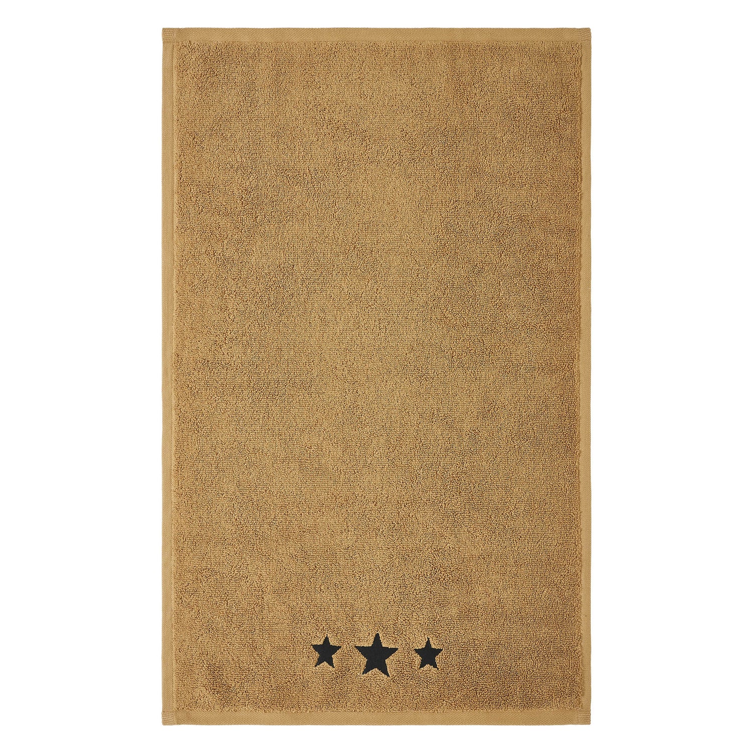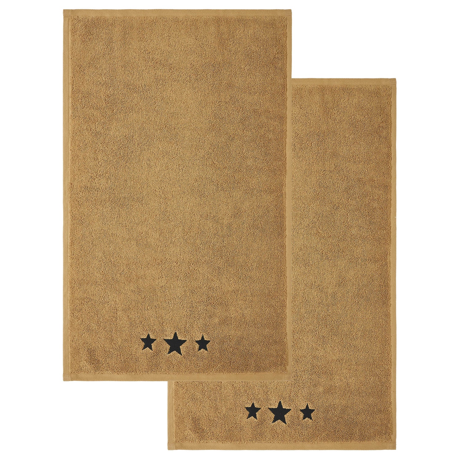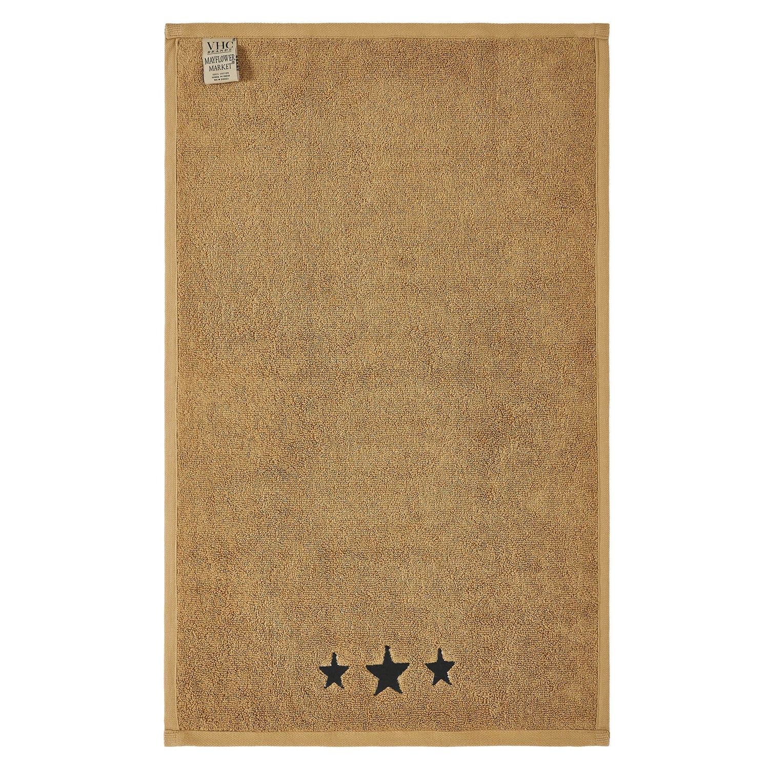 Bring a touch of farmhouse charm to your bathroom with the VHC Brands Black Stars Tan Hand Towel Set of 2. Made from luxurious and absorbent cotton terrycloth, these hand towels are designed to offer both softness and durability. The neutral doe tan hue provides a warm, inviting backdrop, while the embroidered three five-point stars at the bottom, stitched in a country black shade, add a rustic decorative element perfect for country-inspired spaces. Measuring 16x26 inches, these hand towels are ideally sized for use in your bathroom, whether hung by the sink or on a towel bar. The intricate star embroidery and simple design complement farmhouse, country, or prairie-style decor, making them a versatile addition to any washroom. They are machine washable for easy care, offering convenience without sacrificing style. Perfect for adding a cozy, welcoming feel to your home, the VHC Brands Black Stars Tan Hand Towel Set combines functionality and aesthetics. These towels not only serve as a practical necessity but also enhance the overall look of your bathroom with their classic farmhouse design.