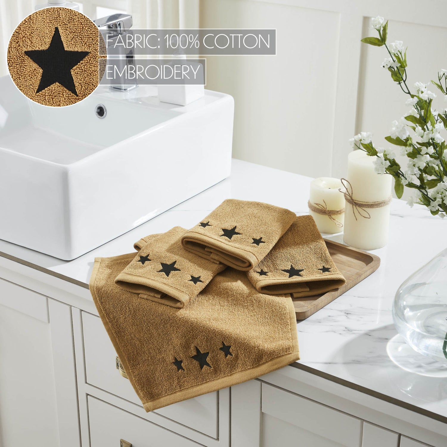Add a touch of farmhouse charm to your bathroom with the VHC Brands Black Stars Tan Washcloth Set of 4. Crafted from luxurious and absorbent cotton terrycloth, these 12x12 washcloths are designed for both practicality and style. The neutral doe tan hue provides a warm, inviting base, while the embroidered design at the bottom features three five-point stars in a striking country black shade, adding a rustic touch to your decor. These square washcloths are perfect for daily use, whether for washing your face or as decorative accents in your guest bathroom. The embroidered stars evoke a classic prairie barn aesthetic, making them a great addition to any farmhouse or country-inspired space. With their soft, absorbent texture, these washcloths offer both comfort and durability, ideal for frequent use. Machine washable for easy care, the VHC Brands Black Stars Tan Washcloth Set combines everyday functionality with timeless rustic appeal. Whether you're looking to update your bathroom with a farmhouse flair or need practical yet stylish washcloths, this set offers the perfect blend of convenience and decorative charm for any country home.