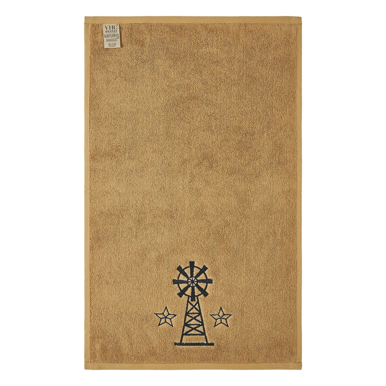 Add a farmhouse touch to your bathroom with the VHC Brands Black Windmill & Stars Tan Hand Towel Set of 2. Crafted from soft and absorbent cotton terrycloth, these towels combine comfort and practicality, perfect for everyday use. The neutral doe tan color provides a warm, inviting background, while the embroidered design at the bottom features a rustic windmill and black barn stars, bringing a country-inspired charm to your bathroom. Measuring 16x26 inches, these hand towels are ideally sized for hanging by the sink or on a towel bar, making them a functional and decorative addition to your bathroom. The embroidered windmill and barn stars enhance the farmhouse aesthetic, creating a homestead feel that fits perfectly in any country-style or rustic washroom. They are machine washable, ensuring easy care and long-lasting durability. With the VHC Brands Black Windmill & Stars Tan Hand Towel Set, you get both style and function. These beautifully embroidered towels bring a touch of rustic elegance to your space, offering a cozy farmhouse vibe while serving as a practical necessity in your bathroom.