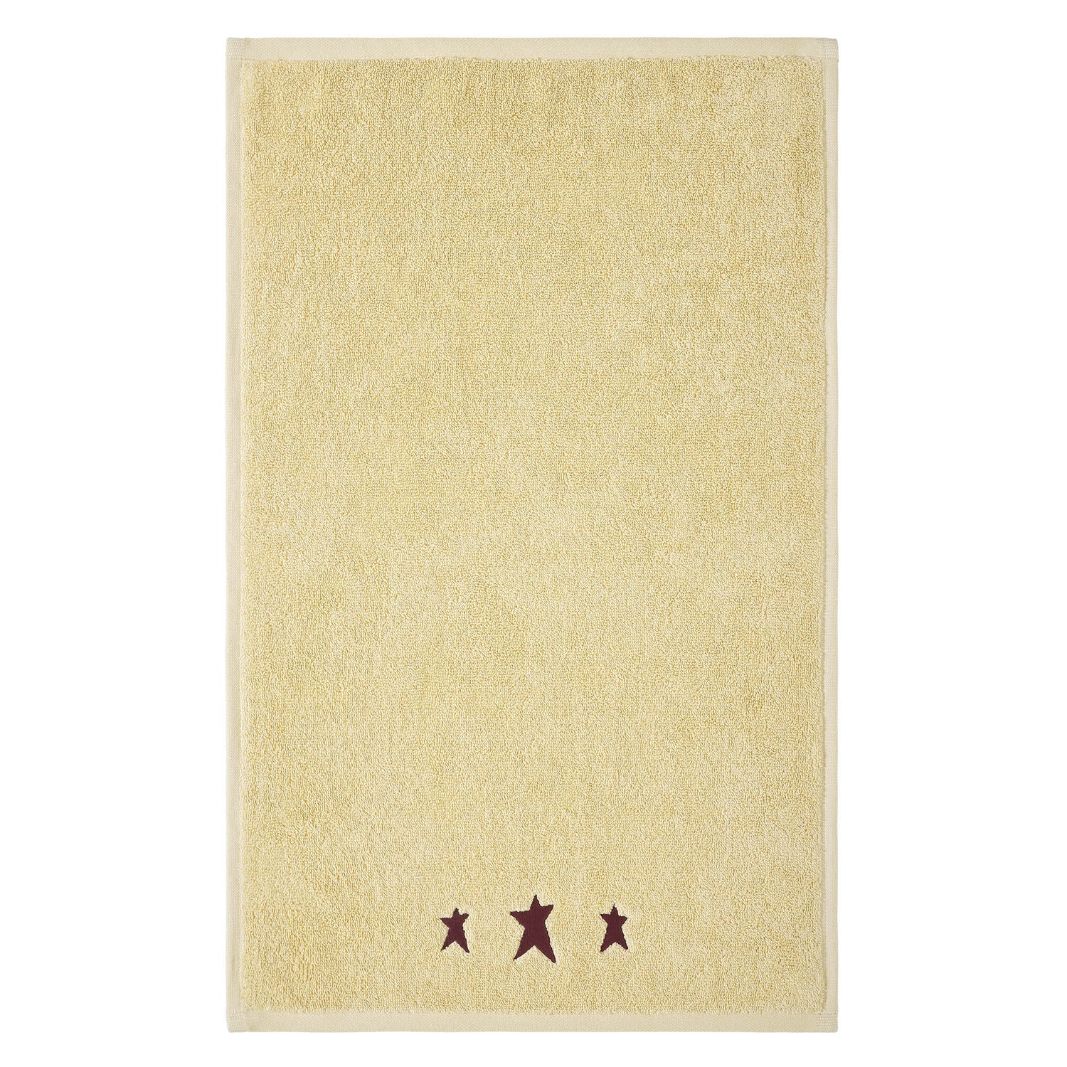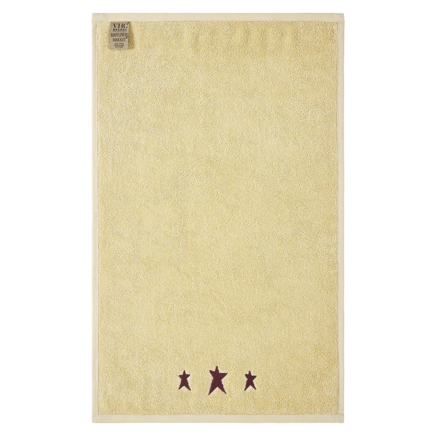 Add a rustic touch to your bathroom with the VHC Brands Burgundy Prim Stars Creme Hand Towel Set of 2. Made from plush and absorbent cotton terrycloth, these towels offer both softness and practicality. The gentle soybean creme hue provides a soothing, neutral backdrop, while the rich burgundy embroidered stars at the bottom bring a striking, primitive charm to your bathroom decor. Each towel measures 16x26 inches, making them perfect for use by the sink or on a towel rack. The three embroidered primitive stars add a touch of rustic elegance, ideal for enhancing primitive or country-style washrooms. These towels are also machine washable, ensuring they are easy to care for while maintaining their softness and quality. Designed to blend practicality with a timeless rustic appeal, the VHC Brands Burgundy Prim Stars Creme Hand Towel Set is a beautiful and functional addition to your bathroom. Perfect for creating a cozy, primitive atmosphere, these towels combine everyday utility with decorative charm, making them a delightful accent for any home.