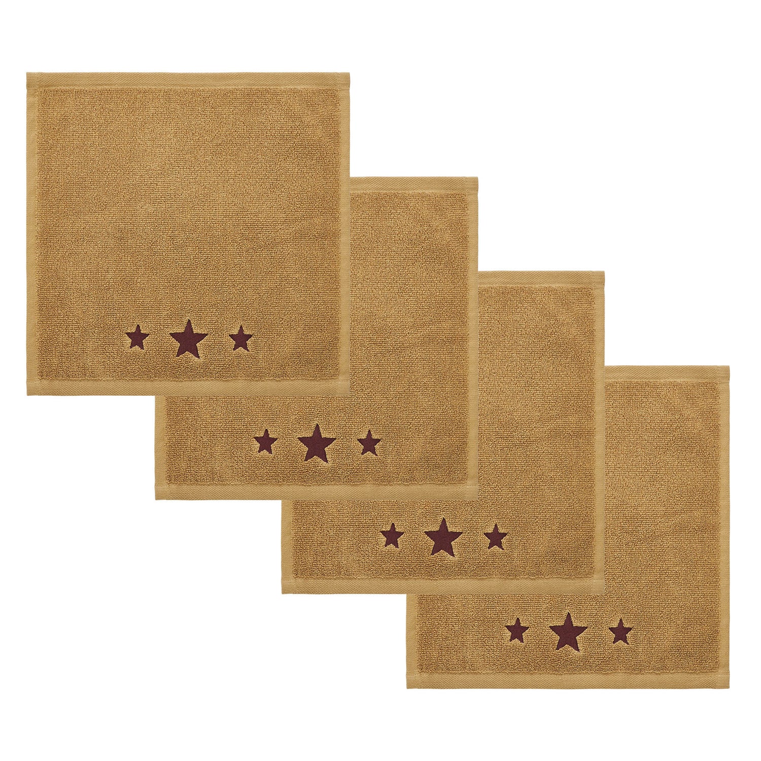 Add a touch of farmhouse charm to your bathroom with the VHC Brands Burgundy Stars Tan Washcloth Set of 4. Crafted from luxurious and absorbent cotton terrycloth, these 12x12 washcloths are designed for both practicality and style. The neutral doe tan hue provides a warm, inviting base, while the embroidered design at the bottom features three five-point stars in a rich burgundy shade, adding a rustic touch to your decor. These square washcloths are perfect for daily use, whether for washing your face or as decorative accents in your guest bathroom. The embroidered stars evoke a classic prairie barn aesthetic, making them a great addition to any farmhouse or country-inspired space. With their soft, absorbent texture, these washcloths offer both comfort and durability, ideal for frequent use. Machine washable for easy care, the VHC Brands Burgundy Stars Tan Washcloth Set combines everyday functionality with timeless rustic appeal. Whether you're looking to update your bathroom with a farmhouse flair or need practical yet stylish washcloths, this set offers the perfect blend of convenience and decorative charm for any country home.