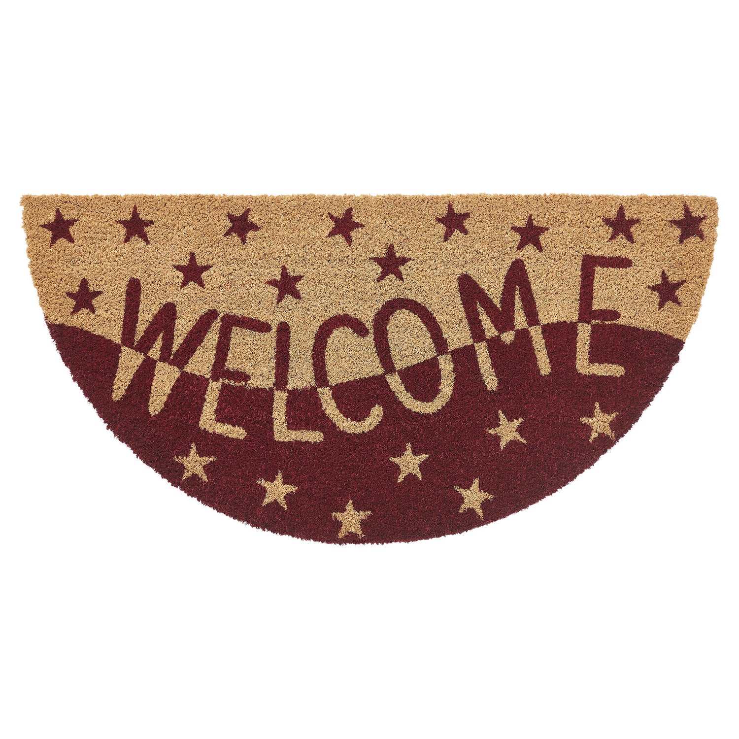 Welcome guests with rustic charm using the VHC Brands Burgundy Tan Stars Coir Welcome Rug Half Circle 16.5x33. This striking two-tone rug features a Welcome message displayed on rolling hills, surrounded by stenciled stars in rich burgundy and natural tan. The half-circle shape adds a unique and inviting touch to your entryway, making it a perfect fit for homes with a primitive or rustic aesthetic. Crafted from durable coir, this rug is designed to trap dirt and debris, keeping your entryway clean while adding a decorative accent. The non-slip PVC backing ensures that the rug stays securely in place, providing stability and safety in high-traffic areas. The stars and welcoming text add a cozy, country feel, making this rug an ideal choice for those who appreciate rustic decor. For easy care, simply shake or vacuum to remove surface dirt, and to maintain its vibrant colors, keep the rug in a sheltered entryway. The VHC Brands Burgundy Tan Stars Coir Welcome Rug combines rustic style with practical functionality, making it a great addition to any home looking to add a warm, welcoming touch to their doorstep.