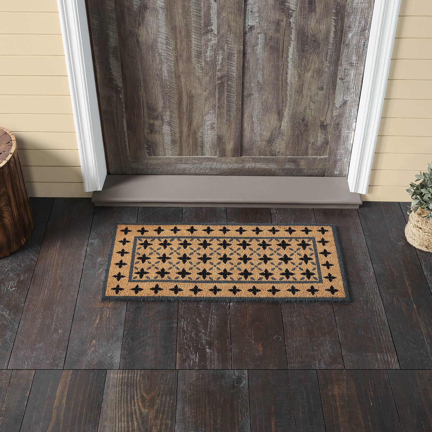 Welcome guests with the sophisticated charm of the VHC Brands Charleston Mosaic Black Grey Coir Welcome Rug Rect 17x36. This beautifully crafted doormat features an intricate mosaic pattern in charcoal grey and deep black, set against a natural tan coir background. The elegant design adds a touch of Southern charm, making it the perfect addition to any rustic or primitive-style home decor. Made from durable coir, this rug is designed to trap dirt and debris while adding a decorative accent to your entryway. The non-slip PVC backing ensures the rug stays securely in place, providing stability and safety in high-traffic areas. Its classic rectangular shape fits neatly by your door, and the detailed stenciled mosaic brings a unique, eye-catching aesthetic to your home's entrance. For easy care, simply shake or vacuum the rug to remove surface dirt. To maintain its vibrant colors and extend its life, place the VHC Brands Charleston Mosaic Black Grey Coir Welcome Rug in a sheltered entryway. Combining rustic elegance with everyday functionality, this rug offers the perfect blend of style and practicality, making it an essential piece for any welcoming home.