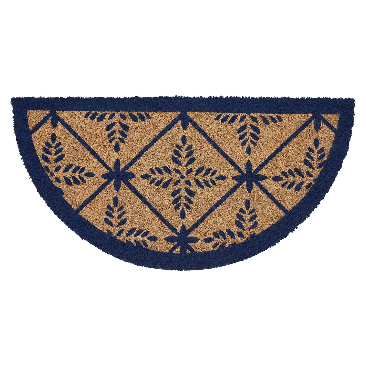 Welcome guests with the refined charm of the VHC Brands Charleston Mosaic Blue Coir Welcome Rug Half Circle 16.5x33. This beautifully designed doormat features an intricate mosaic pattern in deep blue, standing out against a natural tan coir background. Its half-circle shape adds a unique and inviting touch to your entryway, making it a perfect fit for homes with a primitive or rustic aesthetic. Crafted from durable coir, this rug effectively traps dirt and debris, keeping your entryway clean while adding a decorative flair. The non-slip PVC backing ensures the rug stays securely in place, providing stability and safety in high-traffic areas. The deep blue mosaic pattern, inspired by Southern street designs, adds an elegant yet rustic feel, ideal for welcoming guests in style. For easy maintenance, simply shake or vacuum the rug to remove surface dirt. To preserve its vibrant colors and extend its life, place the VHC Brands Charleston Mosaic Blue Coir Welcome Rug in a sheltered entryway. This rug offers the perfect blend of rustic beauty and everyday practicality, making it a great addition to any farmhouse or country-inspired home.