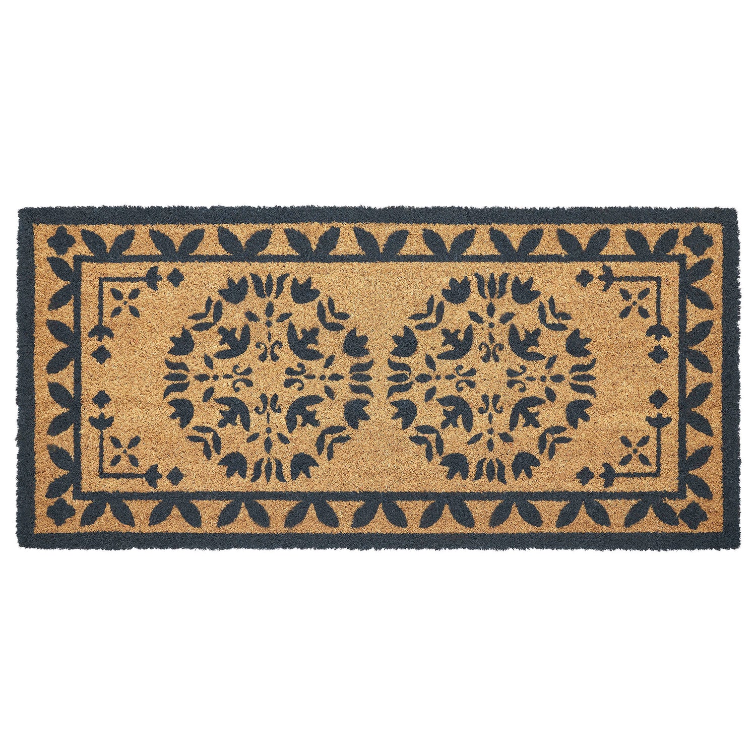 Welcome guests in style with the VHC Brands Charleston Mosaic Charcoal Coir Welcome Rug Rect 17x36. Featuring a detailed mosaic design in rich charcoal grey, this elegant doormat contrasts beautifully against its natural tan coir backdrop, making it an eye-catching accent for any entryway. The intricate stenciled pattern brings a touch of Southern charm, perfect for homes with a primitive or rustic aesthetic. Designed for durability and practicality, this coir rug effectively traps dirt and debris, helping to keep your entryway clean while offering a decorative touch. The non-slip PVC backing ensures the rug stays securely in place, providing stability and safety in high-traffic areas. Its rectangle shape fits neatly at your doorstep, while the mosaic design adds an artistic flair to your home's entrance. For easy care, simply shake or vacuum the rug to remove surface dirt. To preserve its vibrant colors and extend its life, place the VHC Brands Charleston Mosaic Charcoal Coir Welcome Rug in a sheltered entryway. Combining timeless style with everyday functionality, this rug offers the perfect balance of rustic elegance and practical utility, making it a must-have for any home.