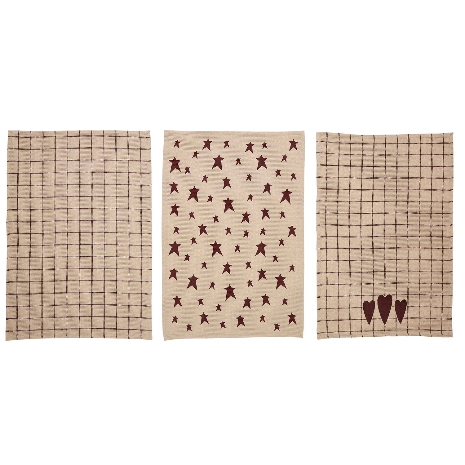 - Upgrade your kitchen decor with the Connell Collection Cotton Kitchen Towel set of 3 in a rich Burgundy hue. These Printed tea towels feature a Primitive and Country star pattern, adding a touch of rustic charm to your space.