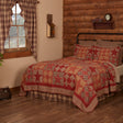 The VHC Brands 3-Piece King Bedding Set includes 1 soft King quilt and 2 matching King shams, adding comfort and style to your bedroom. Soft 100% cotton, hand-quilted, and bursting with subtle colors in diagonal rows of alternating 5-point stars and five patch blocks, this 110Wx97L quilt is reminiscent of the American West with its timeless, heirloom look. Our khaki, burgundy, and woodland brown plaid patchwork bring a casual yet classic, rustic flair. Reverses to a brown and tan plaid.. Soft 100% cotton, hand-quilted, and bursting with subtle colors in rows of alternating 5-point stars and five patch blocks, this 21x37 pillow cover brings to mind the American West with its heirloom look. The khaki, burgundy, and woodland brown plaid patchwork provides a casual yet classic touch. Reverses to a matching plaid with three tan chalk button closures.