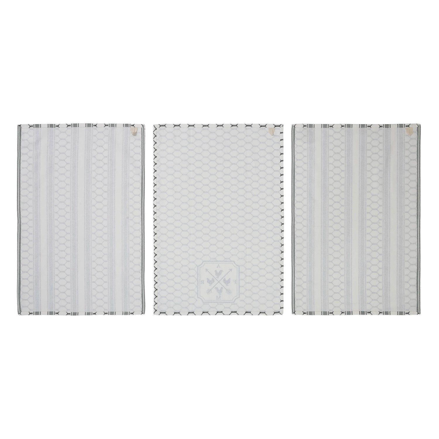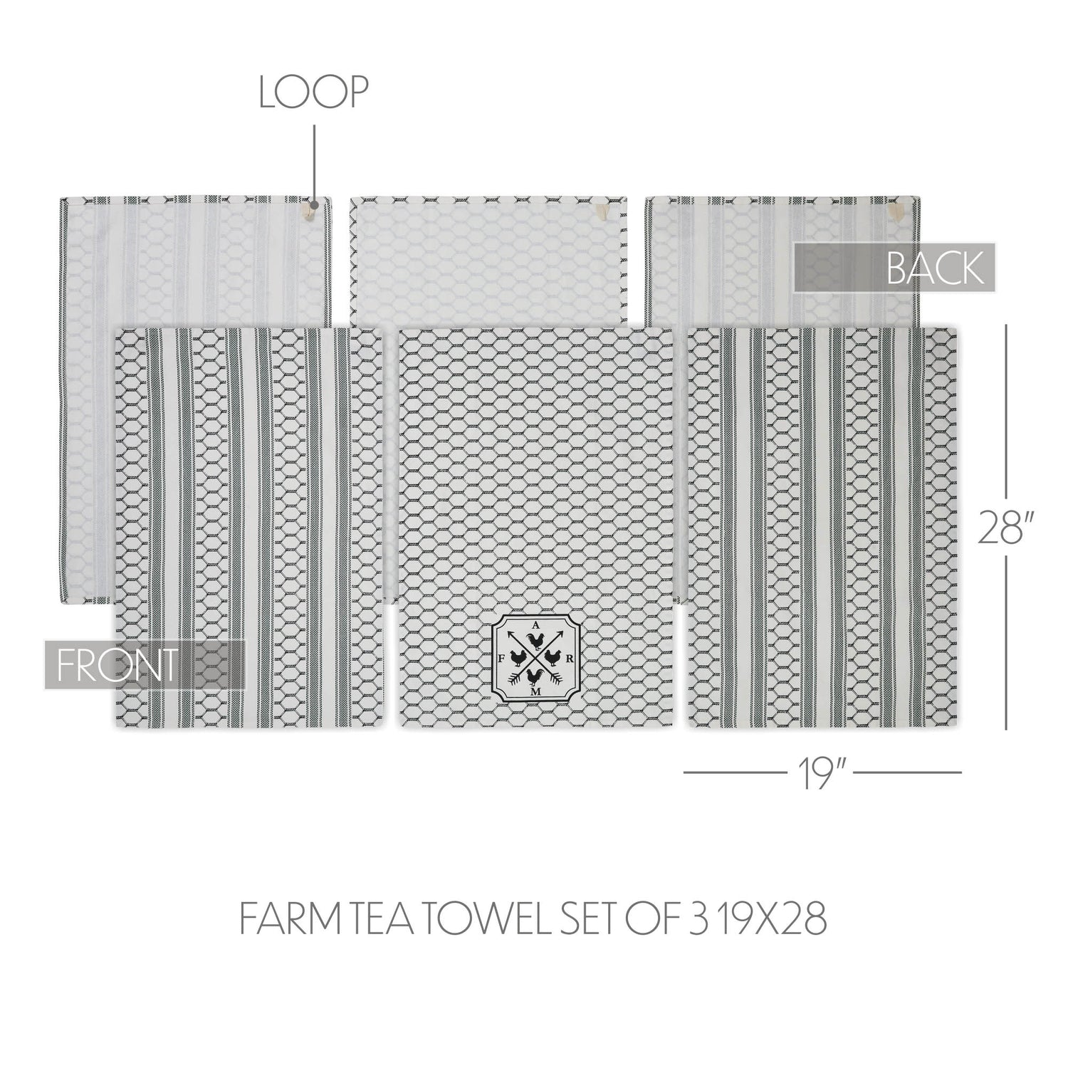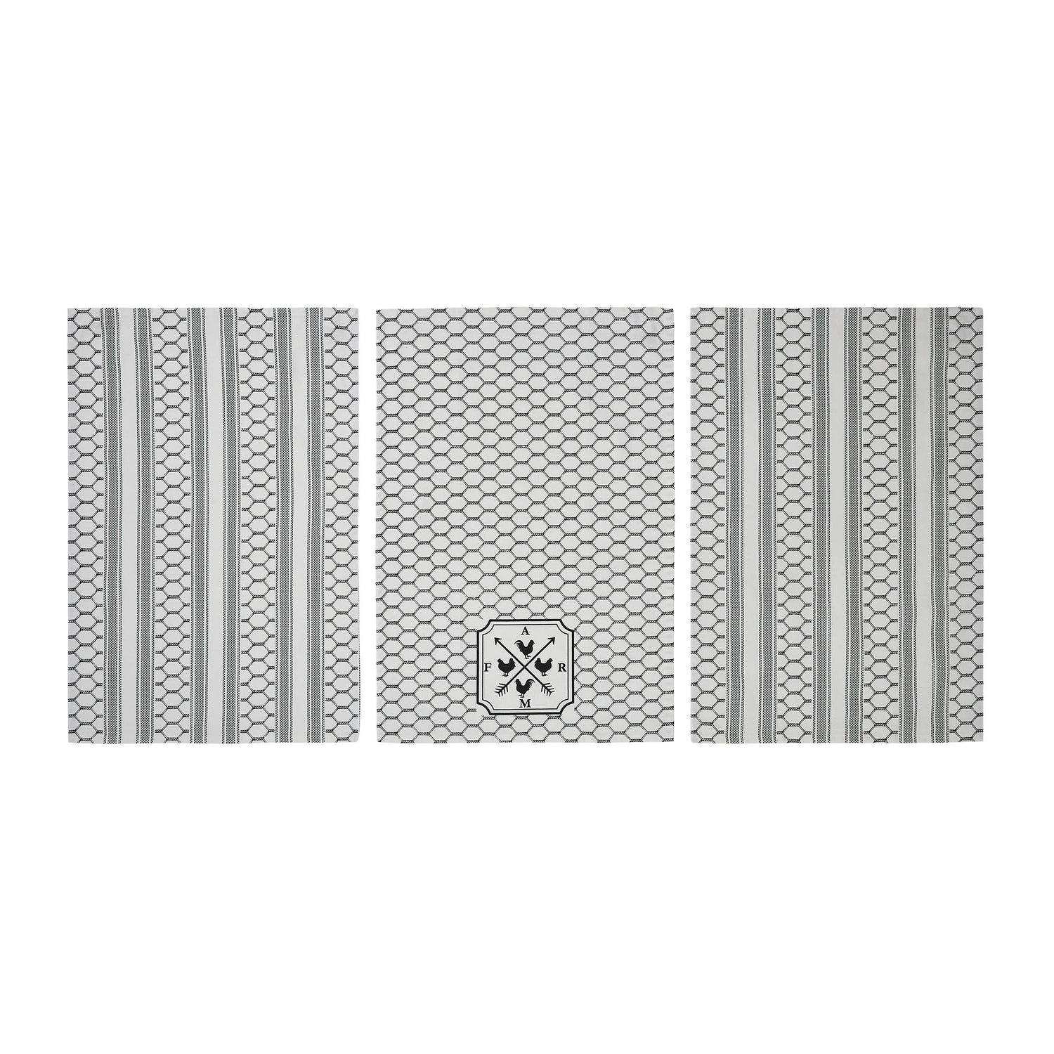 - Set of 3 Towels: Towel 1 showcases two arrows crossed in a weathervane style with FARM at the compass points and Chickens directing the way. The other two towels feature fence and stripe detail.