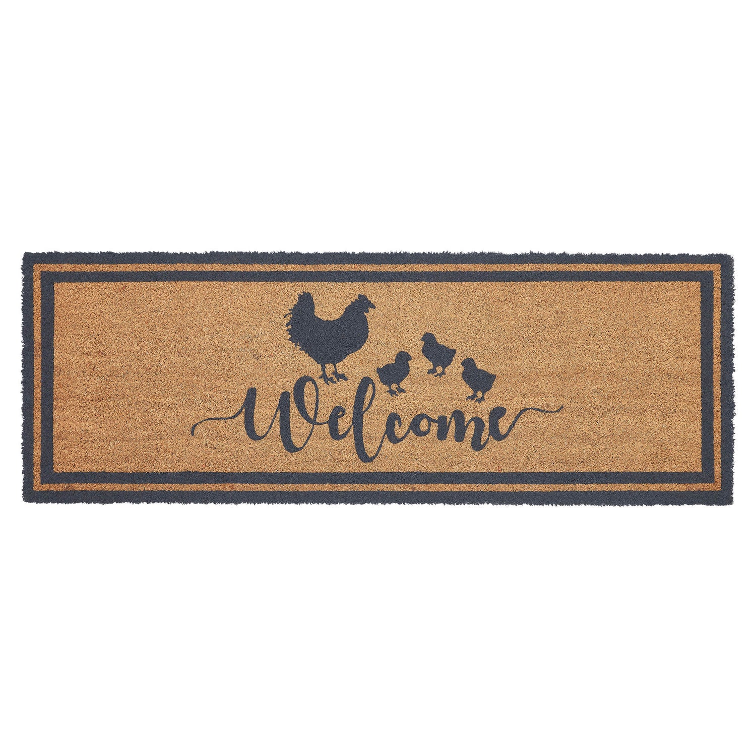 Welcome guests with the delightful charm of the VHC Brands Down Home Hen & Chicks Coir Welcome Rug Rect 17x48. This adorable doormat features the silhouette of a mother hen and her three baby chicks, all standing proudly over a warm Welcome message stenciled in rustic black. Set against a natural tan background, the design is beautifully enhanced by a double black line border, adding a classic farmhouse touch to your entryway. Crafted from durable coir, this rug is perfect for high-traffic areas, effectively trapping dirt and debris while providing a decorative accent to your home. Its rectangular shape fits snugly at your doorstep, and the non-slip PVC backing ensures stability, keeping the mat securely in place for the safety of your guests. The whimsical farmyard design creates a cozy and inviting atmosphere, making it an ideal choice for country-style homes. For easy maintenance, simply shake or vacuum the rug to remove surface dirt. To maintain its vibrant colors and prolong its life, it's best to keep the VHC Brands Down Home Hen & Chicks Coir Welcome Rug in a sheltered entryway. Combining practicality with rustic charm, this rug is a perfect way to greet family and friends while adding a touch of warmth to your home.