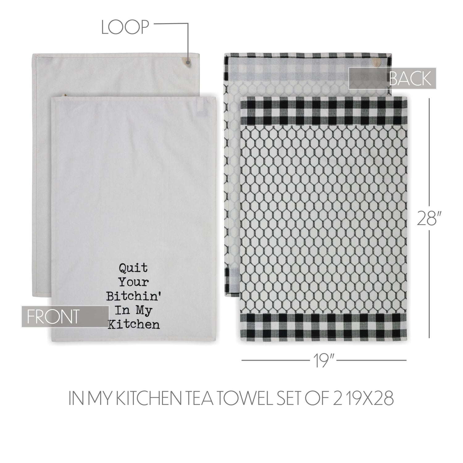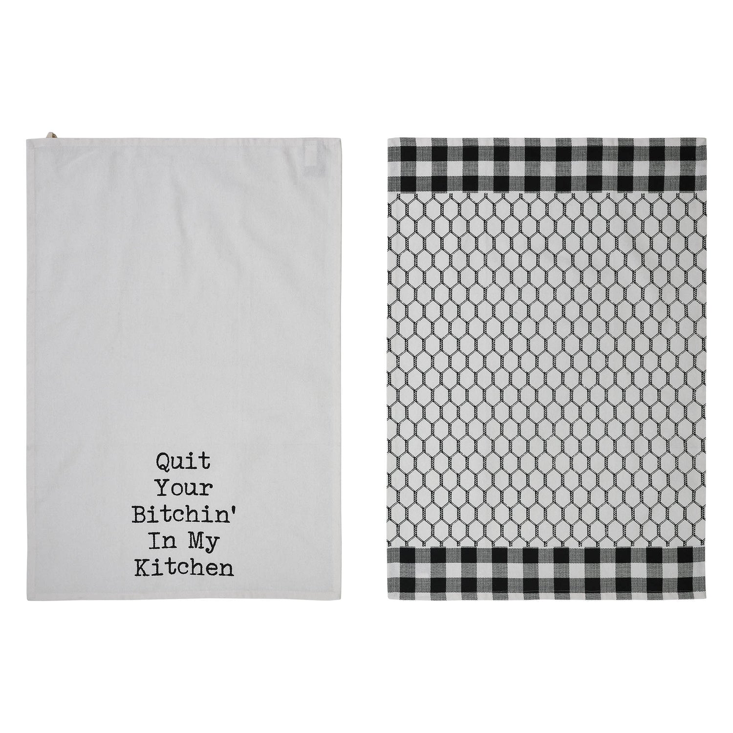 - Sassy Sayings: If you have a complaint, keep it to yourself! These towels say "Quit Your Bitchin In My Kitchen" on one towel and a farm fence design on the other, a spunky addition to your kitchen decor.
