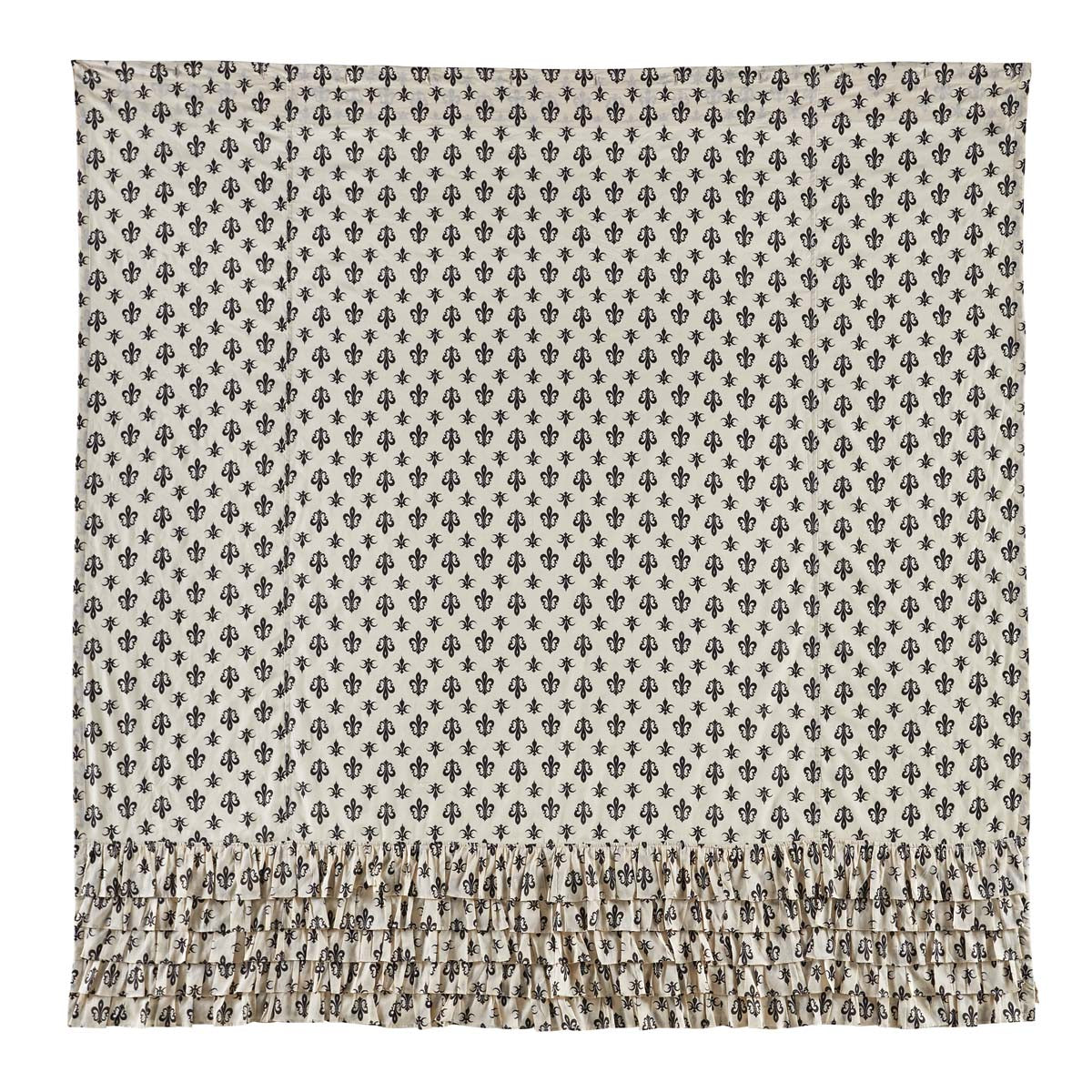 Complement your bath area using old world, country style with the Elysee Ruffled Shower Curtain. "Elysee", also the name of a famous palace in Paris, translates from the French to "Elysium". By its name, our 72x72 shower curtain brings to mind delightful vintage elegance and gorgeous historical fancy. Made from 100% cotton voile, this slightly transparent curtain provides a timeless classic touch with its black fleur-de-lis print over creme and 5 layers of ruffles along its bottom edge. Our fabric shower curtain has both a rod pocket and button holes for hooks for versatility and convenience. Use with French country, shabby chic, farmhouse, or vintage country looks.