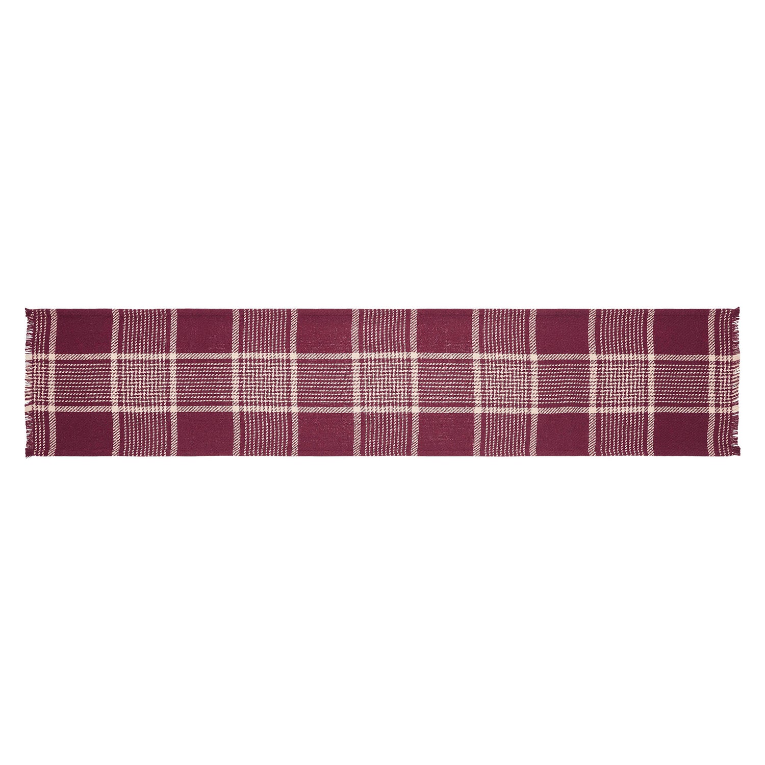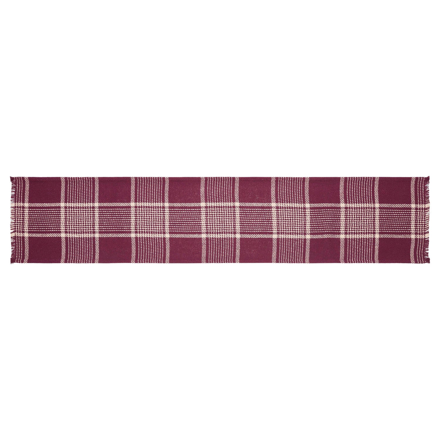 Give your tabletop decor a seasonal upgrade with traditional plaid in deep tones. The Eston Burgundy Tan Runner measures 12 by 60 inches and features a woven base in recycled cotton with frayed edging. The dark fall table runner features a burgundy base with deep tan striping. Pair with other pieces from the Eston Burgundy Tan Plaid Collection by VHC for a timeless farmhouse look.