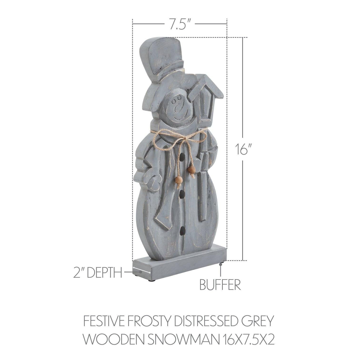 Bring cheerful charm and rustic warmth to your winter decor with the VHC Brands Festive Frosty Distressed Wooden Snowman. Standing 7.5x16 inches, this delightful figurine is crafted from tropical wood and features a joyful snowman wearing a hat and scarf. Painted in a soft winter grey with light tan distressing, it captures a vintage-inspired look full of seasonal character. Carved details and a twine tie with small wooden beads add texture and a handcrafted touch, enhancing the snowman's country-style appeal. Affixed to a sturdy wooden base, this figurine is designed for stable placement on mantels, shelves, or tabletops. Its neutral color palette and simple silhouette make it a perfect addition to farmhouse, rustic, or traditional winter themes. Ideal for the bathroom, bedroom, dining room, entryway, kitchen, or living room, the Festive Frosty Distressed Wooden Snowman brings cozy, nostalgic charm to any space. Built to last and easy to maintain, simply wipe clean with a soft cloth to preserve its timeless beauty. This classic snowman is sure to become a favorite part of your seasonal decor year after year.