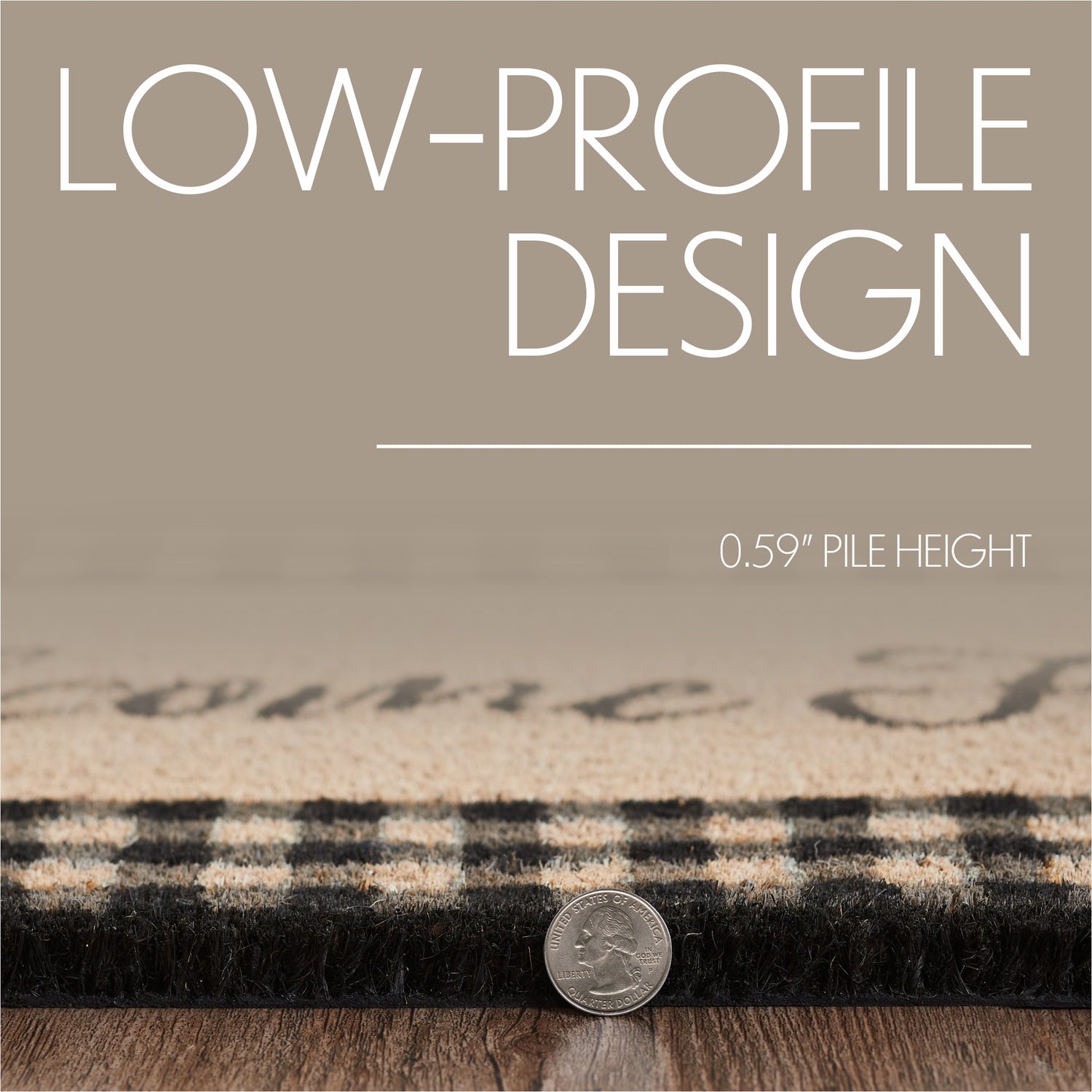Welcome guests with a touch of farmhouse charm using the VHC Brands Finders Keepers Welcome Friends Coir Welcome Rug Half Circle 16.5x33. Featuring the warm greeting Welcome Friends stenciled in black against a dark cream background, this rug creates an inviting atmosphere right at your doorstep. The design is accented with a checkered border in country black and charcoal grey, adding a cozy, homestyle touch that's perfect for farmhouse or country-style decor. Made from durable coir, this half-circle entry rug is designed to effectively trap dirt and debris, making it ideal for busy entryways. The non-slip PVC backing ensures stability, keeping the rug securely in place, whether it's at your front door or in a sheltered entryway. Its rustic design and classic checkered border bring a welcoming feel to any space while offering the practicality of easy maintenance. To keep the colors vibrant and prolong the life of your VHC Brands Finders Keepers Welcome Friends Coir Rug, simply shake or vacuum to remove surface dirt and keep it in a protected area. Whether you're looking to enhance your entryway with a homestyle accent or provide a warm welcome to friends and family, this rug is the perfect blend of rustic charm and everyday utility for your home.