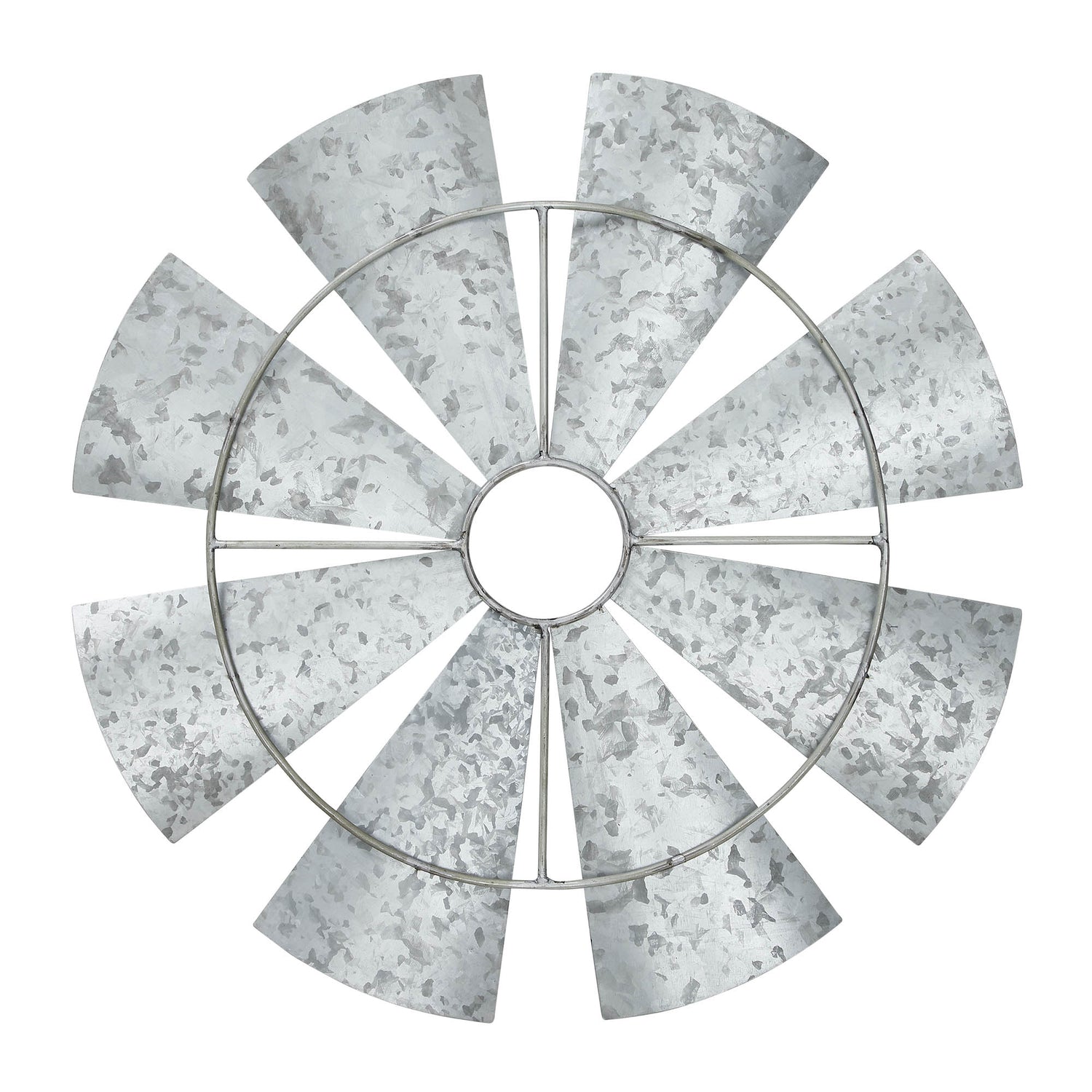 Bring rustic charm to your home with the VHC Brands Galvanized Metal Windmill Blades Wall Hanging 16.75x16.75. This decorative wall art features a beautifully crafted windmill design with 8 curved blades made from galvanized grey metal. The distressed finish adds a vintage-inspired touch, creating a timeless piece that complements rustic farmhouse and country-style interiors. Perfect for enhancing a variety of spaces, this round wall hanging makes a striking addition to living rooms, dining rooms, kitchens, bedrooms, bathrooms, or entryways. Its minimalist, solid-color design allows it to seamlessly blend with different decor themes while serving as a subtle nod to Americana and farm-inspired living. Whether displayed as a standalone centerpiece or incorporated into a gallery wall, this windmill wall hanging adds depth and character to any room. Maintaining the VHC Brands Galvanized Metal Windmill Blades Wall Hanging is effortless
