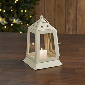 Add a touch of rustic charm to your home decor with the VHC Brands Metal Lantern Tealight Holder. This antique white metal lantern features glass windows and star cutouts, creating a cozy ambiance when illuminated by a tealight candle. Measuring 7x4.5x4.5 inches, this lantern is perfectly sized for placement on kitchen or dining tables, entryway consoles, or living room mantels, adding a primitive and rustic feel to any space. Crafted from durable metal and glass materials, this lantern is designed to withstand regular use and is easy to maintain simply wipe it clean with a soft cloth for hassle-free upkeep. Its solid antique white color complements a variety of interior styles, from country farmhouse to vintage chic, making it a versatile addition to your home decor arsenal. Whether used as a standalone accent piece or paired with other lanterns and candles, this tealight holder exudes timeless elegance and rustic appeal. For safe enjoyment, it's important to follow the cautionary guidelines, ensuring that the lantern is not touched or moved while warm or when a candle is lit. Keep it out of reach of children and away from flammable objects to prevent accidents. Elevate your dining room, entryway, or living room decor with the enchanting glow of candlelight emanating from the VHC Brands Metal Lantern Tealight Holder, and create a welcoming atmosphere that exudes warmth and hospitality.