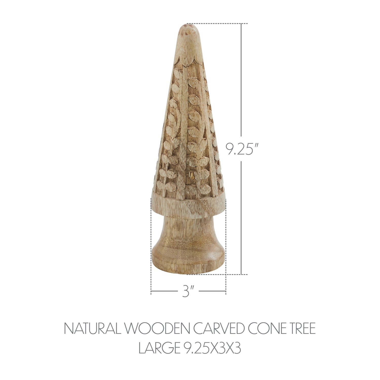 Celebrate the warmth of the winter season with the VHC Brands Wooden Carved Cone Christmas Tree in Large. Crafted from tropical wood, this cone-shaped figurine features delicate carved vine details that wind gracefully around its surface. Finished in a natural wood tan stain, the solid color and organic texture evoke a primitive, rustic charm that complements a variety of seasonal styles. Standing 9.25 inches tall and 3 inches wide, this tree makes a subtle yet sophisticated statement on mantels, tabletops, or entryway consoles. Its carved detailing adds depth and visual interest without overpowering surrounding decor. The sturdy wooden base ensures stable placement, making it a reliable accent piece throughout the winter months. Ideal for decorating the bathroom, bedroom, dining room, entryway, kitchen, or living room, this figurine brings a natural elegance to any space. Its timeless design and earthy tone blend effortlessly with traditional, farmhouse, or minimalist aesthetics. To keep it looking its best, simply wipe clean with a soft cloth between uses.