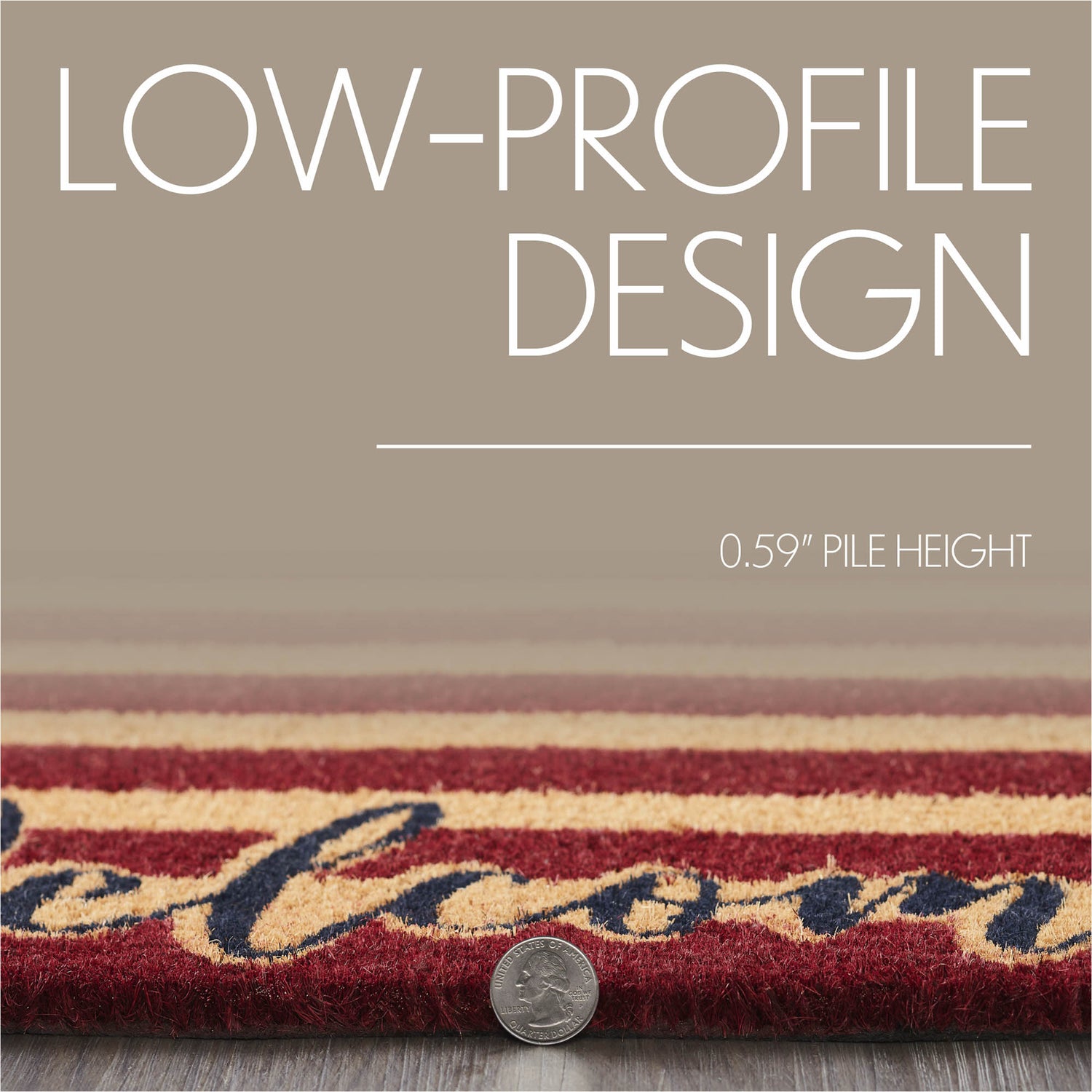 Welcome guests with the spirited charm of the VHC Brands Patriotic Stripes Coir Welcome Rug Rect 17x48. This delightful doormat features a vibrant red striped background adorned with blue stars in the corners, creating a warm and inviting Welcome message. Its Americana-inspired design makes it an ideal addition to any entryway, especially during Independence Day celebrations or year-round for those who cherish patriotic decor. Crafted from durable coir, this rug is designed to effectively trap dirt and debris, keeping your entryway clean and welcoming. The rectangular shape fits snugly at your doorstep, while the non-slip PVC backing ensures stability, preventing slips and keeping the mat securely in place even in high-traffic areas. The striking combination of red, white, and blue creates a festive atmosphere that resonates with warmth and patriotism. For easy maintenance, simply shake or vacuum the rug to remove surface dirt. To prolong its vibrant colors and extend its life, it's best to keep the VHC Brands Patriotic Stripes Coir Welcome Rug in a sheltered entryway. Blending festive style with practical functionality, this rug is a must-have for any home that wants to greet visitors with a cheerful, patriotic welcome.