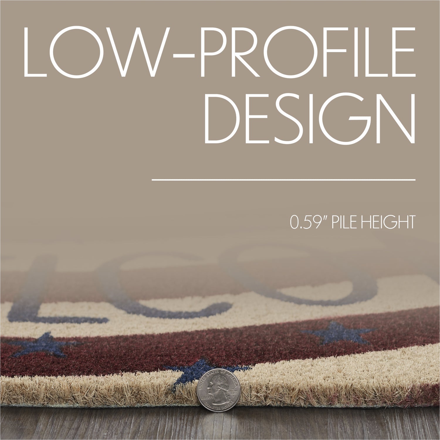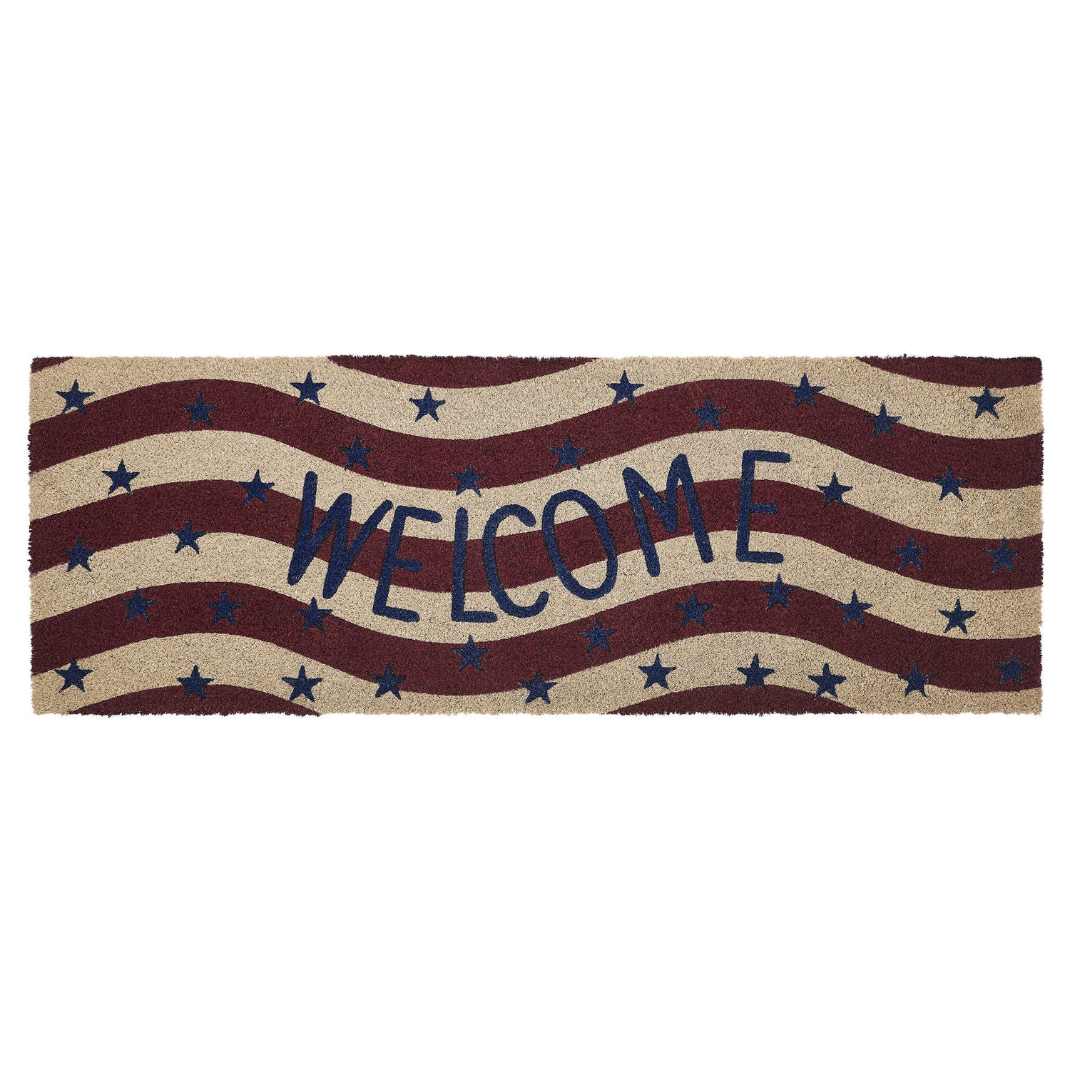 Welcome guests with a touch of patriotism using the VHC Brands RWB Flag Stripes Coir Welcome Rug Rect 17x48. This vibrant doormat features waving flag stripes in merlot red and fog white, showcasing a warm Welcome greeting surrounded by five-point stars in patriot blue. Its eye-catching design makes it a perfect addition to any entryway, especially during Independence Day celebrations or for those who love Americana decor year-round. Crafted from durable coir, this rug effectively traps dirt and debris, helping to keep your entryway clean while adding a festive touch. The rectangular shape fits neatly at your doorstep, while the non-slip PVC backing ensures that the rug stays securely in place, providing stability and safety in high-traffic areas. The combination of bold colors and patriotic symbols creates a cheerful atmosphere that invites friends and family into your home. For easy maintenance, simply shake or vacuum the rug to remove surface dirt. To maintain its vibrant colors and prolong its lifespan, it's best to keep the VHC Brands RWB Flag Stripes Coir Welcome Rug in a sheltered entryway. Combining functional design with festive flair, this rug is an essential piece for any home looking to greet visitors with warmth and patriotic spirit.