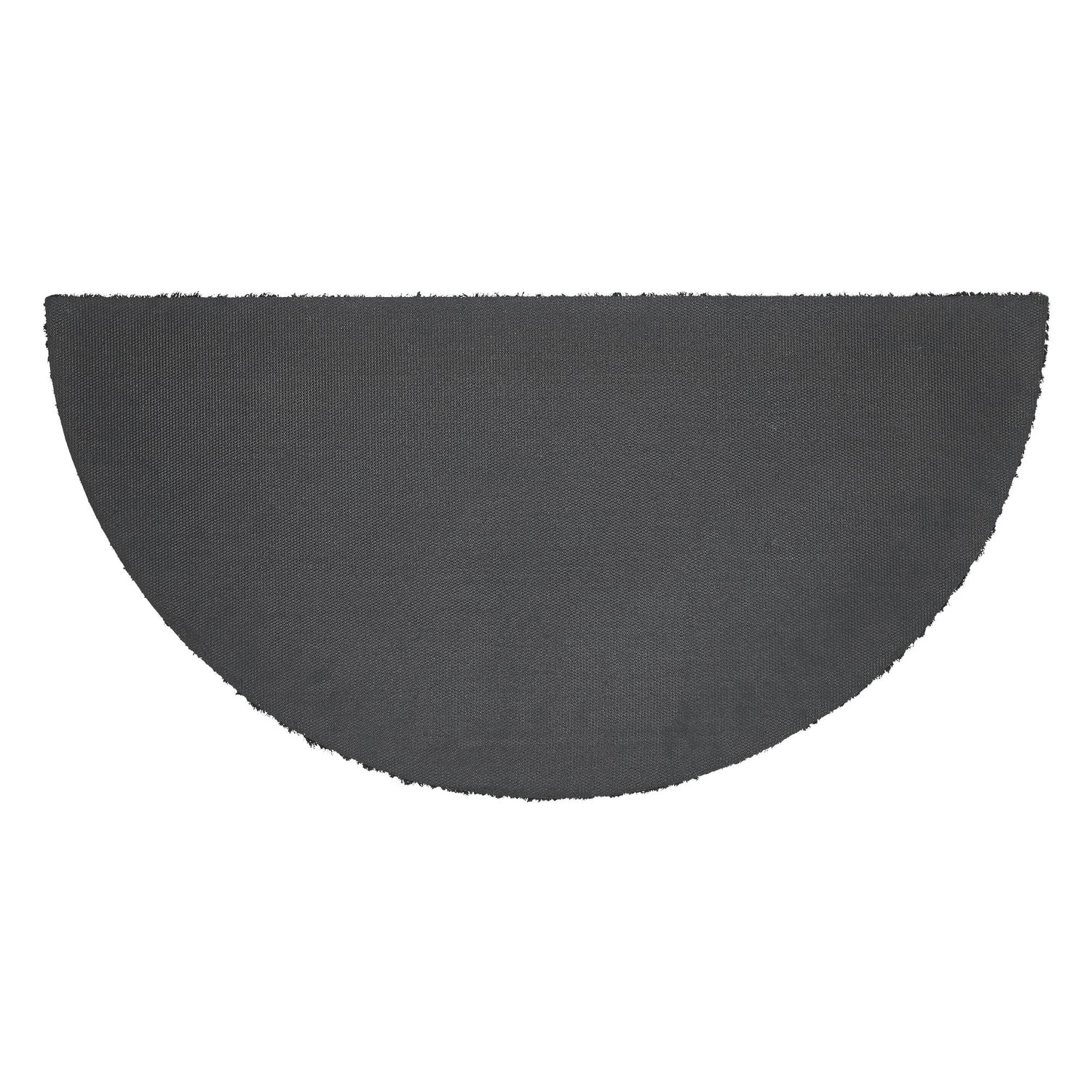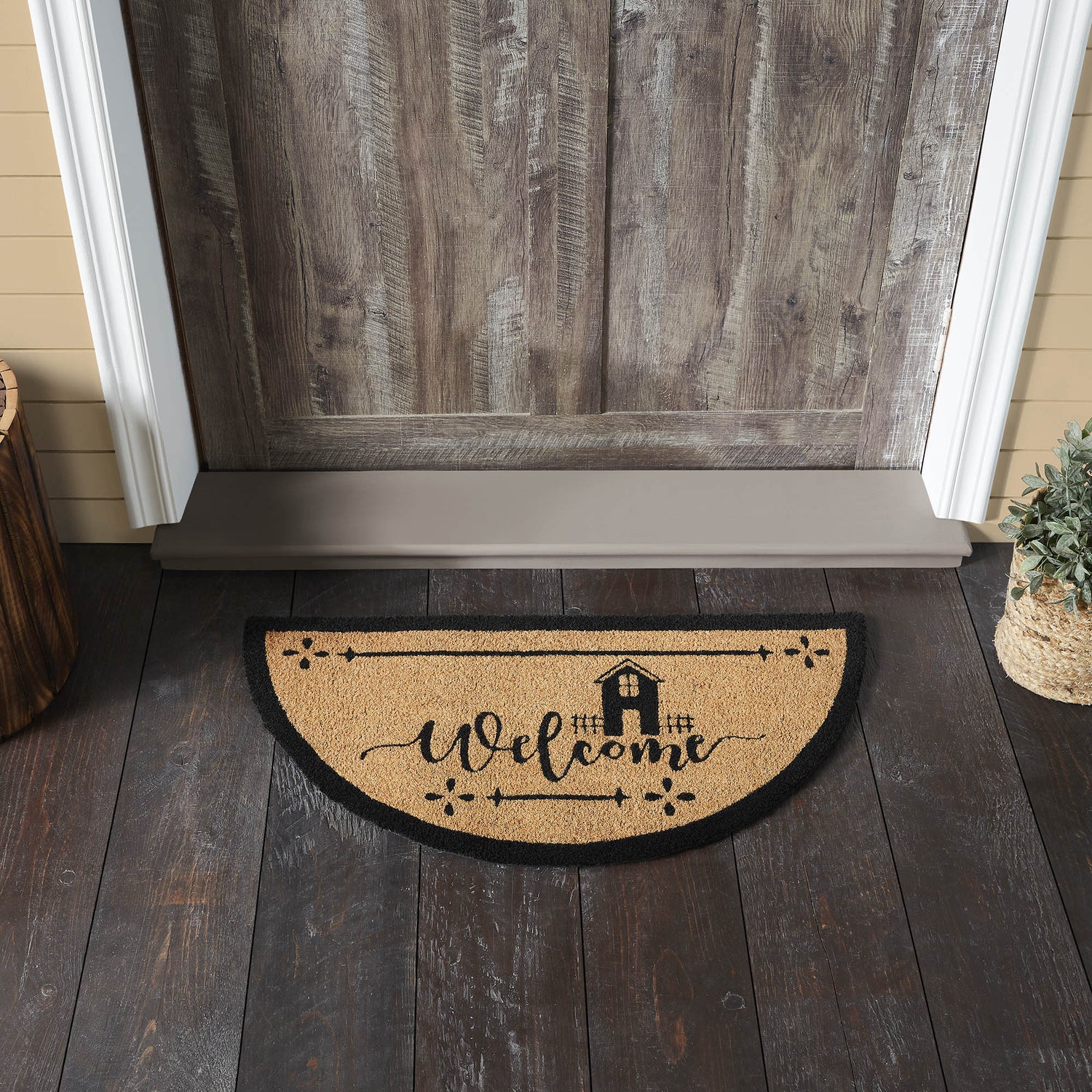 Welcome guests with rustic charm using the VHC Brands Saltbox Coir Welcome Rug Half Circle 16.5x33. This beautifully crafted doormat features a stenciled saltbox house and fence alongside a warm Welcome greeting, all in country black against a natural tan coir background. The design is framed by a subtle bar and droplet pattern, adding a unique decorative touch that perfectly complements farmhouse or primitive-style decor. Ideal for high-traffic entryways, this coir rug is designed to trap dirt while adding a cozy, homestyle feel to your home. The half-circle shape fits neatly against your doorstep, and the non-slip PVC backing ensures stability, keeping the rug securely in place. With its primitive design and welcoming message, this rug creates an inviting atmosphere for family, friends, and guests alike. For easy maintenance, simply shake or vacuum to remove surface dirt and keep the colors vibrant by placing the rug in a sheltered entryway. The VHC Brands Saltbox Coir Welcome Rug combines rustic elegance with practical functionality, making it a perfect addition to your entryway or porch, offering both style and everyday utility to your home.
