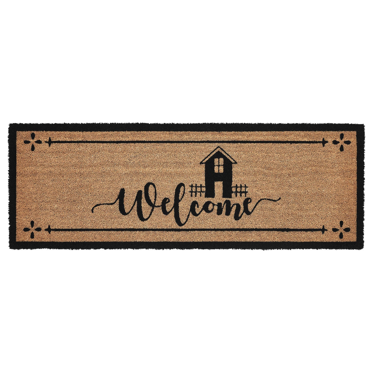 Enhance your entryway with the charming appeal of the VHC Brands Saltbox Coir Welcome Rug Rect 17x48. This inviting doormat features a delightful design with a classic saltbox house and fence alongside a warm Welcome greeting in country black. Set against a natural tan background, the rug is beautifully framed with a bar and droplet design, adding an elegant touch that complements any rustic or primitive-style home. Made from durable coir, this rug effectively traps dirt and debris, helping to keep your entryway clean while providing a decorative accent. Its rectangular shape fits perfectly at your doorstep, and the non-slip PVC backing ensures stability, preventing slips and keeping the mat securely in place in high-traffic areas. The combination of a homestyle greeting and charming imagery creates a cozy, welcoming atmosphere for all who enter your home. For easy maintenance, simply shake or vacuum the rug to remove surface dirt. To preserve its vibrant colors and prolong its life, it's best to keep the VHC Brands Saltbox Coir Welcome Rug in a sheltered entryway. Combining practical functionality with rustic charm, this rug is a perfect addition to any home looking to offer a warm and inviting entrance.