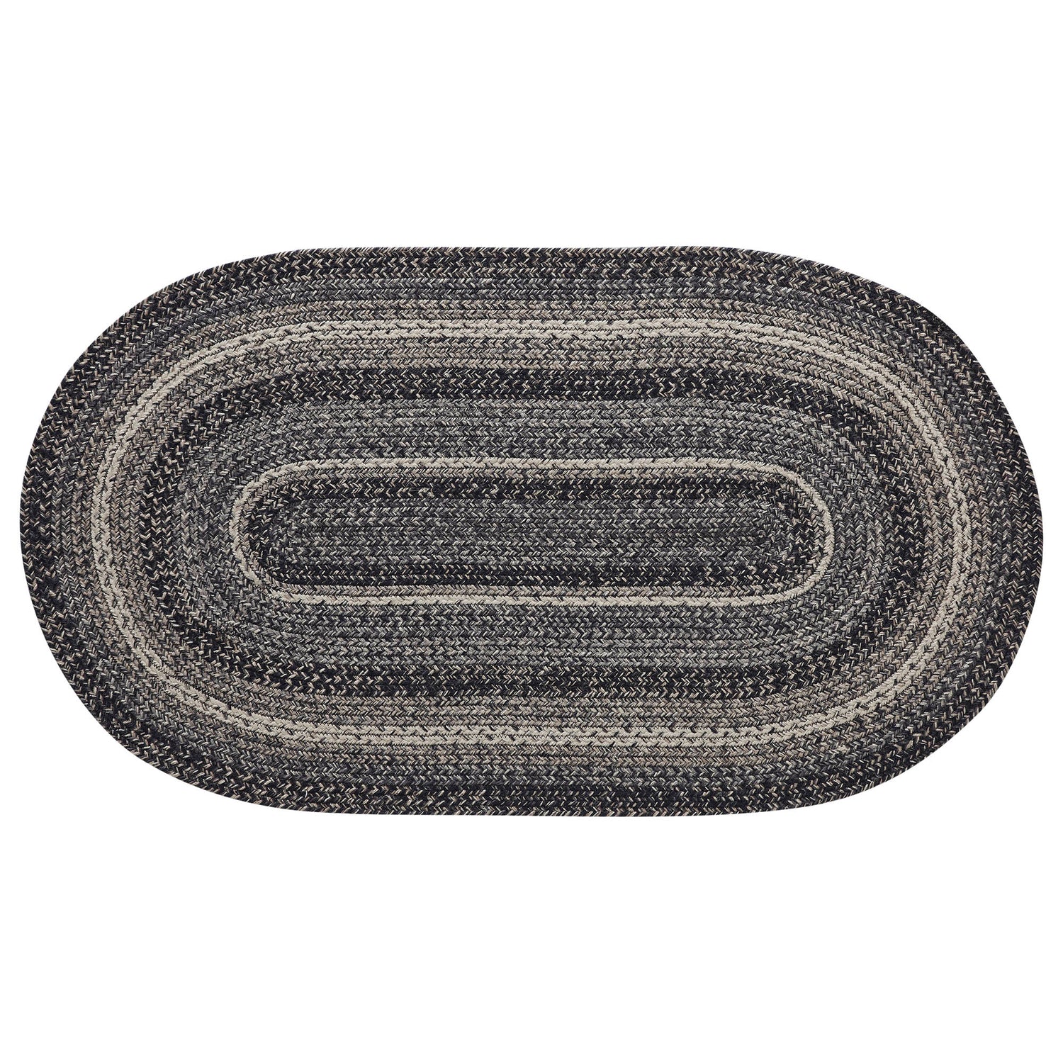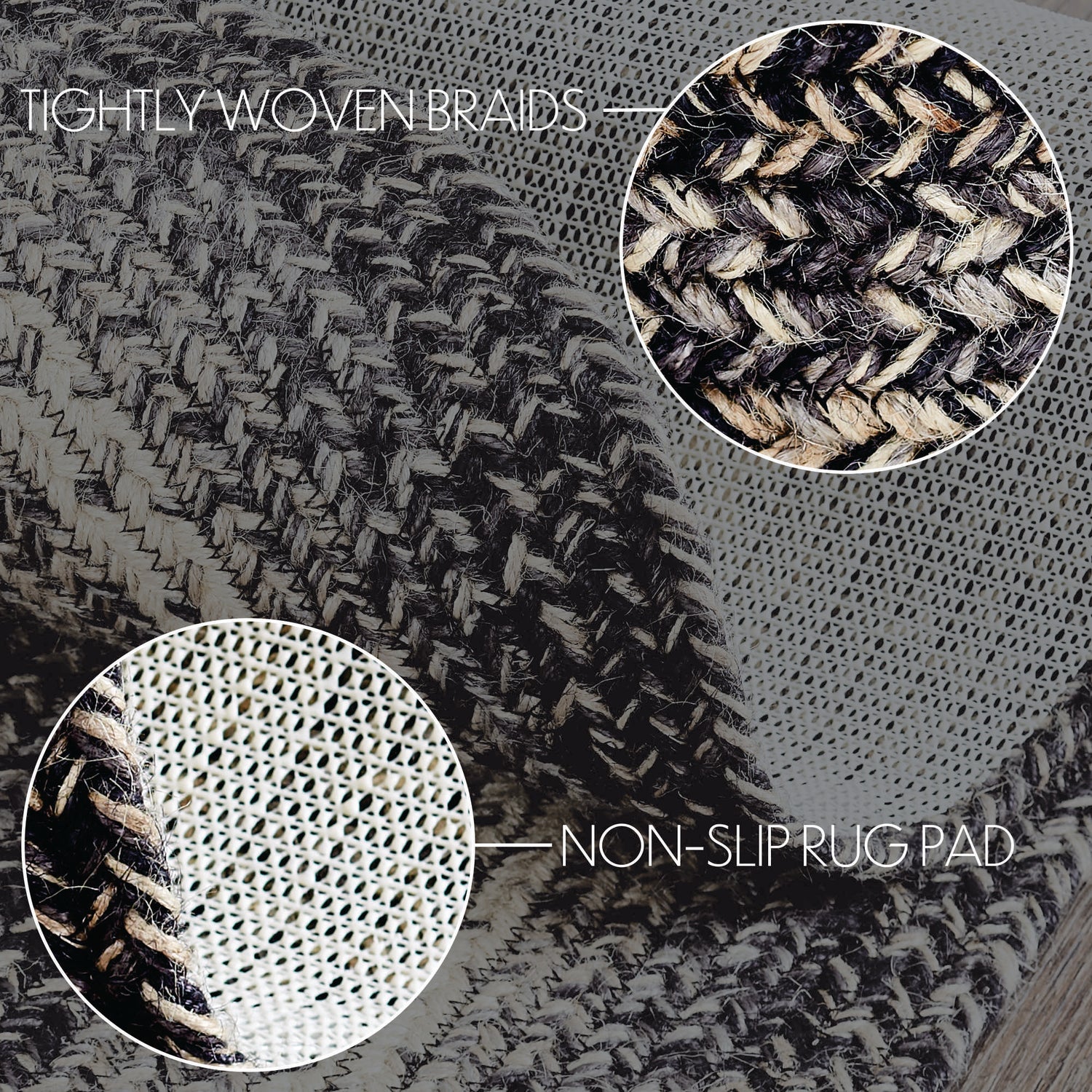 Create a neutral, modern look for your entryway with classic shades of black and creme in a curl-resistant jute blend that adds style and safety. The Sawyer Mill Black White Jute Rug measures 27x48 inches and features a classic oval shape and tight braids constructed with a durable jute blend. The special blend relaxes faster and stays flat. The included PVC mat makes sure your beautifully braided jute rug stays exactly where it should. Features a blend of black, grey and creamy white for a minimalist look that complements a wide array of modern and vintage farmhouse decor.