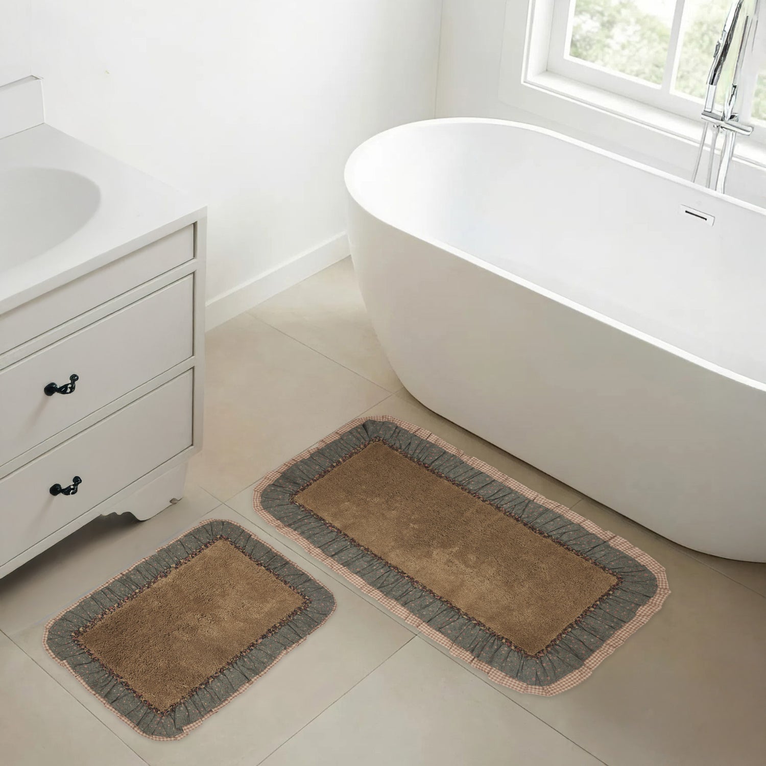 - 2-piece Set - Includes one 20x30-inch and one 27x48-inch tan bathmat. Crafted from 100% soft cotton in a rustic plaid design, this set brings warm country charm and cozy farmhouse comfort to your bathroom d
