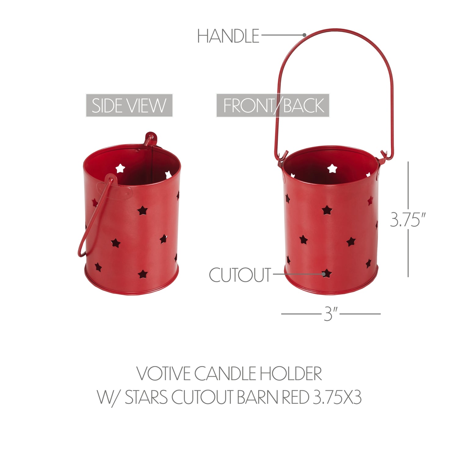 Illuminate your patriotic celebrations with the VHC Brands Patriotic Metal Votive Candle Holder w/ Stars Cutout 3.75x3. This charming tabletop accent features a round metal design in a rich barn red finish, complete with a convenient carry handle. Cutout stars adorn the exterior, allowing the flickering glow of a votive candle to shine through, creating a warm and inviting ambiance that