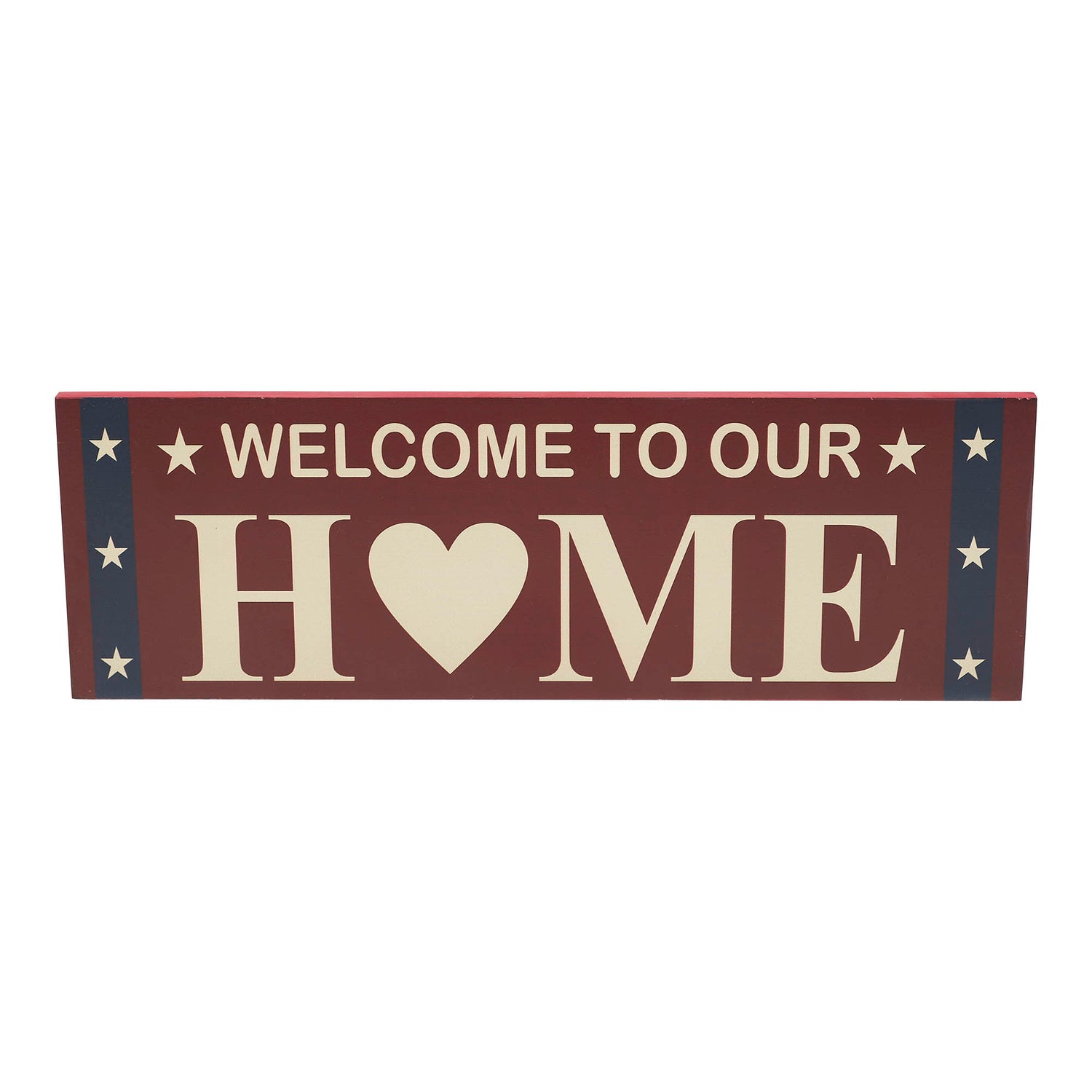- Patriotic Welcome Design: Features the welcoming phrase "Welcome To Our Home" in creme, with a heart replacing the letter "O" in "home," accented by star trim for a festive touch.