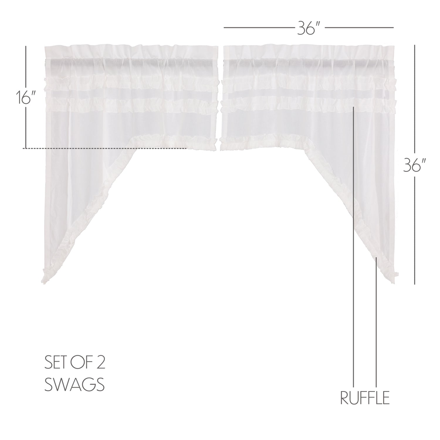 - Ruffled Farmhouse Swag - Includes two 36 by 36 by 16 inch swag panels. Swag curtains are a classic country style featuring angled draping to frame your window while leaving space open for additional natural light. Our swag curtains include a rod pocket for easy hanging.