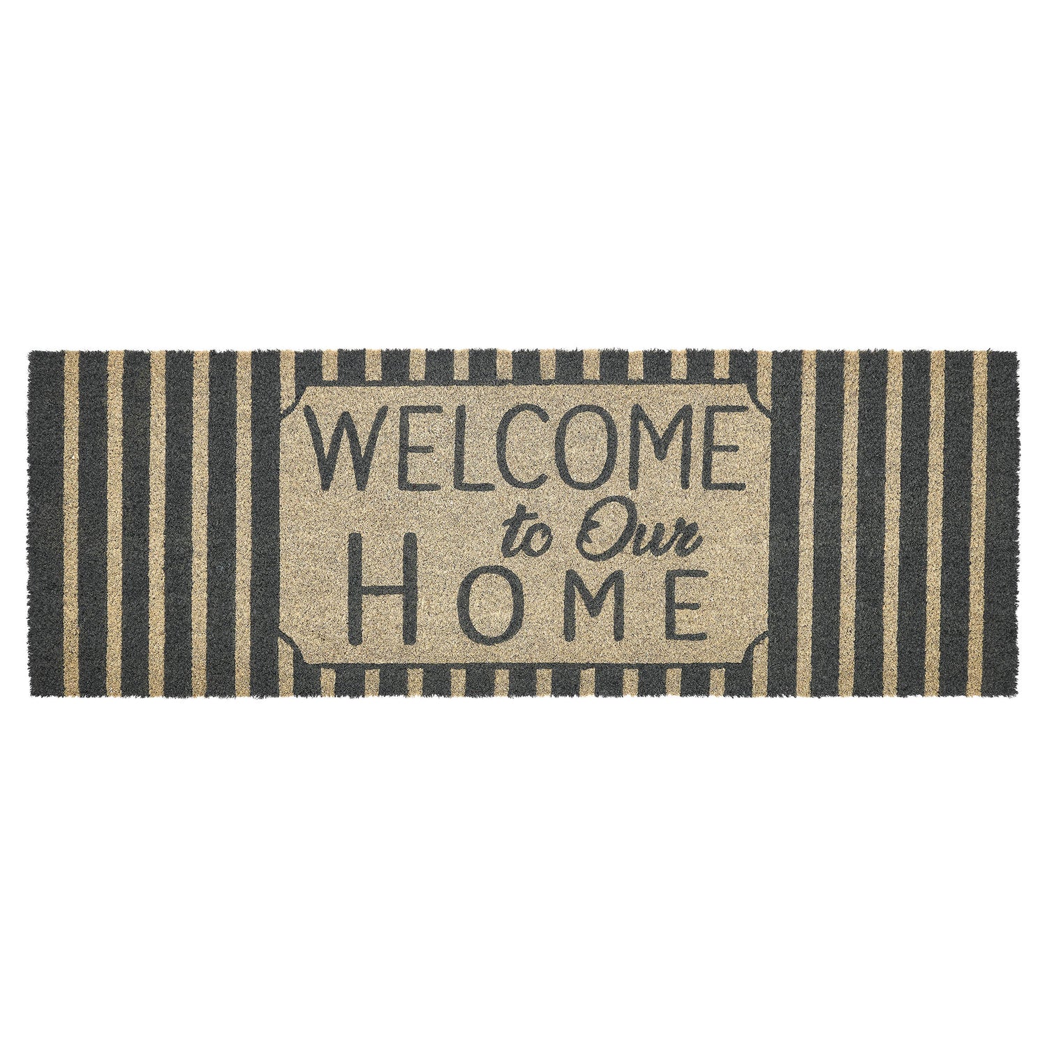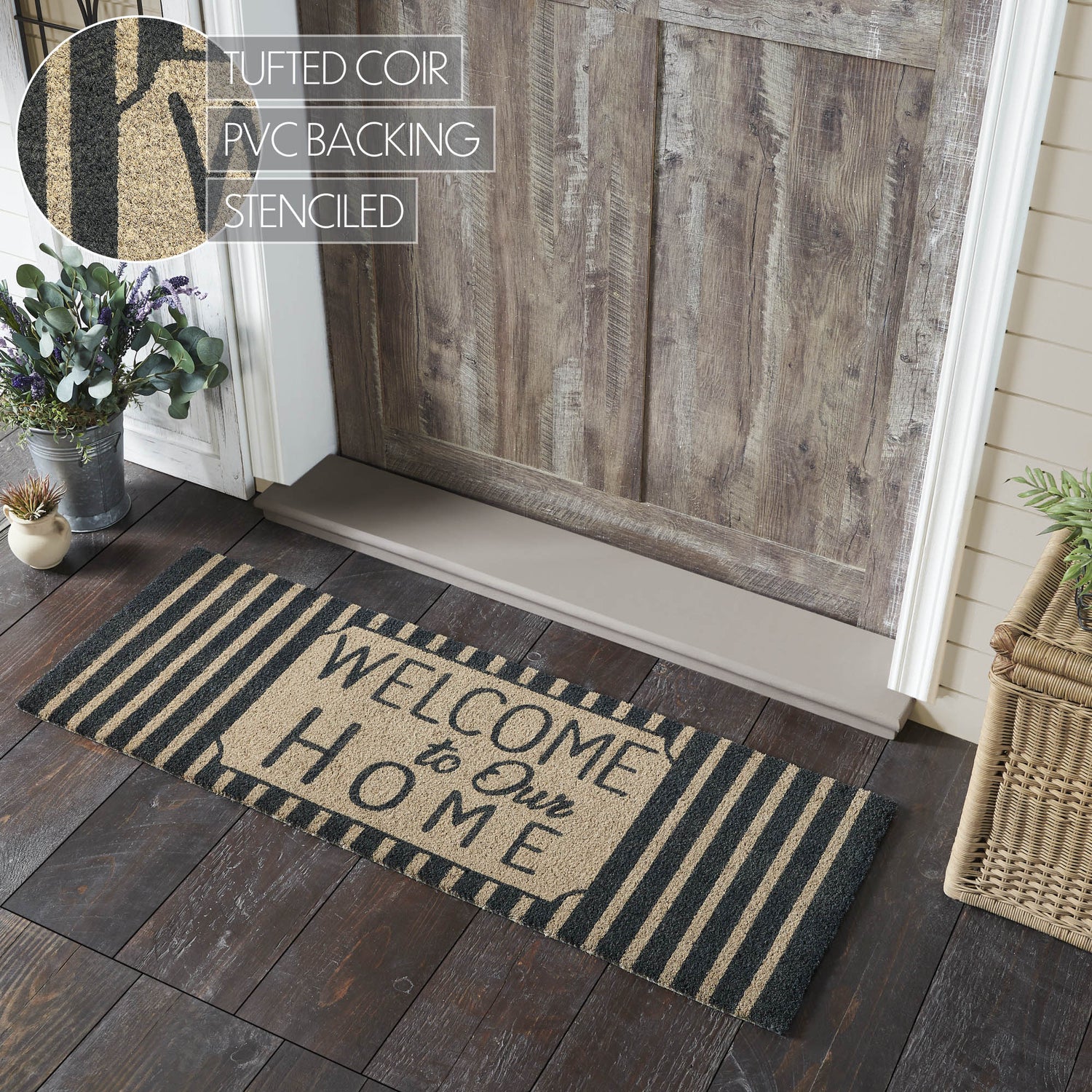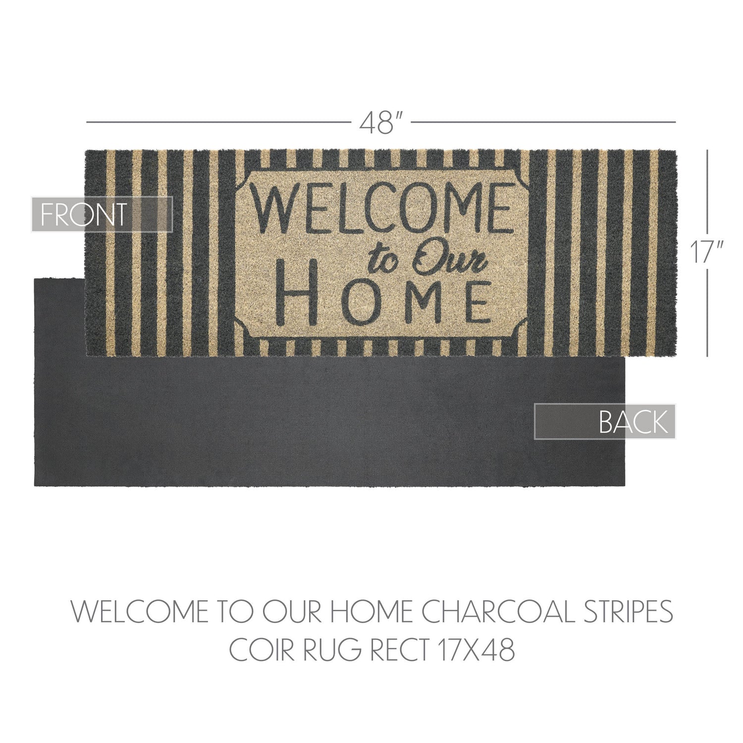 Welcome guests with the charming appeal of the VHC Brands Welcome To Our Home Charcoal Stripes Coir Welcome Rug Rect 17x48. This stylish doormat features the inviting phrase Welcome to Our Home prominently displayed against a classic dark grey and creme striped background. Its sophisticated design adds a touch of rustic elegance, making it a perfect addition to any country-style entryway. Crafted from durable coir, this rug is designed to trap dirt and debris effectively, helping to keep your home clean and welcoming. The rectangular shape fits seamlessly at your doorstep, while the non-slip PVC backing ensures stability, keeping the rug securely in place even in high-traffic areas. The combination of classic stripes and a heartfelt message creates a warm atmosphere that welcomes family and friends. For easy maintenance, simply shake or vacuum the rug to remove surface dirt. To prolong its vibrant colors and extend its life, it's best to keep the VHC Brands Welcome To Our Home Charcoal Stripes Coir Welcome Rug in a sheltered entryway. This rug beautifully combines practicality with style, making it an essential piece for any home looking to create a warm and inviting entrance.