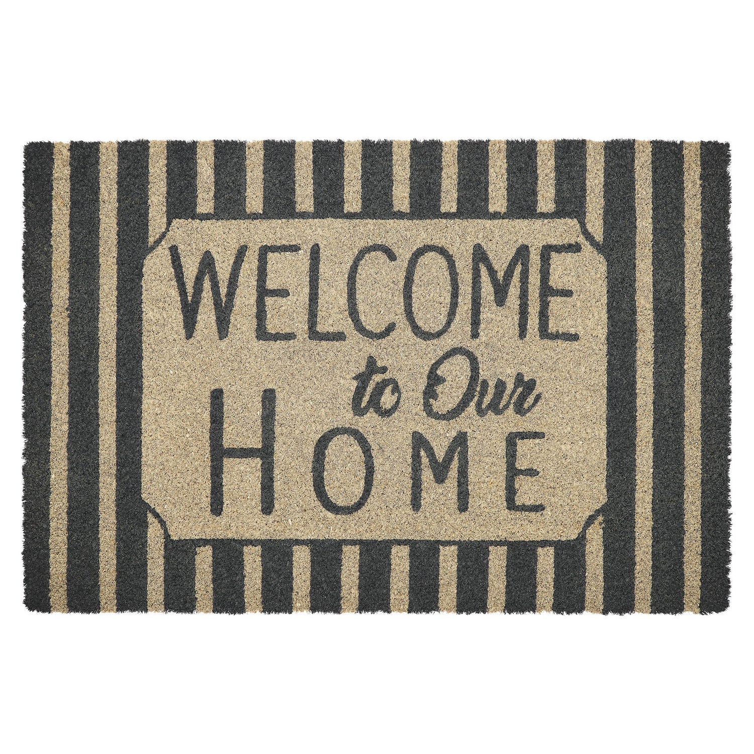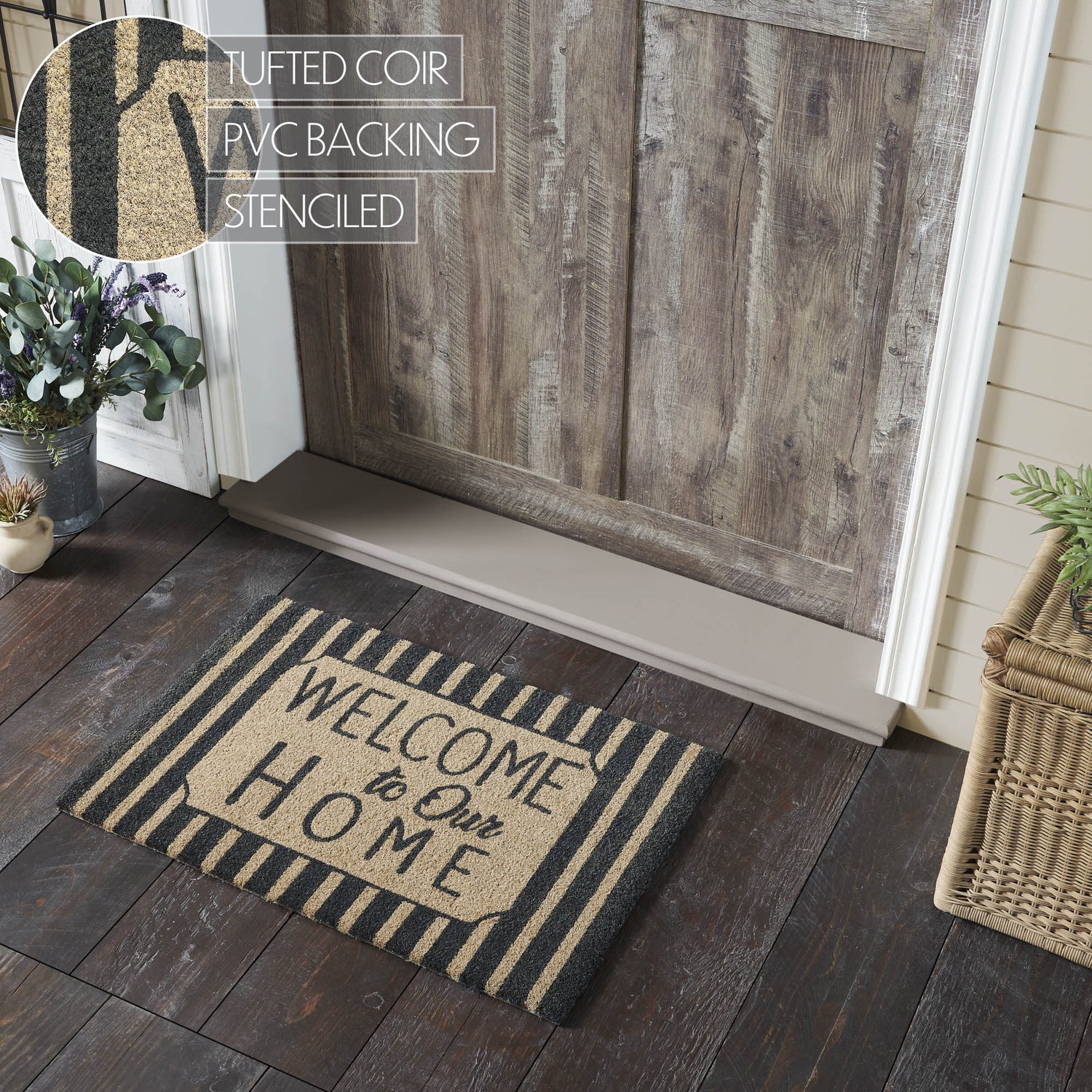 Welcome your guests with the inviting charm of the VHC Brands Welcome To Our Home Charcoal Stripes Coir Welcome Rug Rect 20x30. This stylish doormat features the warm greeting Welcome to Our Home prominently displayed against a classic dark grey and creme striped background. Its elegant design adds a rustic touch to any entryway, making it a perfect fit for country or farmhouse decor. Crafted from durable coir, this rug effectively traps dirt and debris, ensuring that your entryway stays clean and welcoming. The rectangular shape is designed to fit snugly at your doorstep, while the non-slip PVC backing provides stability, preventing slips and keeping the mat securely in place, even in high-traffic areas. The combination of stripes and a heartfelt message creates a warm atmosphere that invites family and friends into your home. For easy maintenance, simply shake or vacuum the rug to remove surface dirt. To preserve its vibrant colors and prolong its lifespan, it's best to keep the VHC Brands Welcome To Our Home Charcoal Stripes Coir Welcome Rug in a sheltered entryway. Combining practical functionality with charming design, this rug is an essential addition to any home looking to create a warm and inviting entrance.