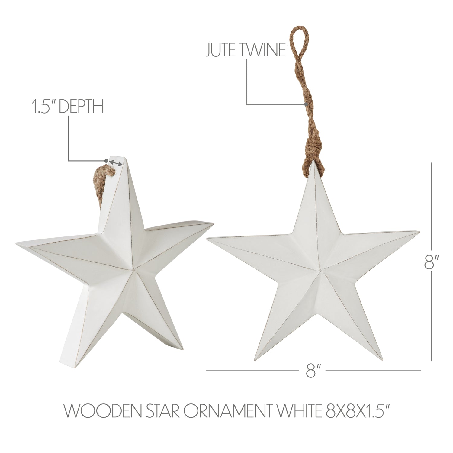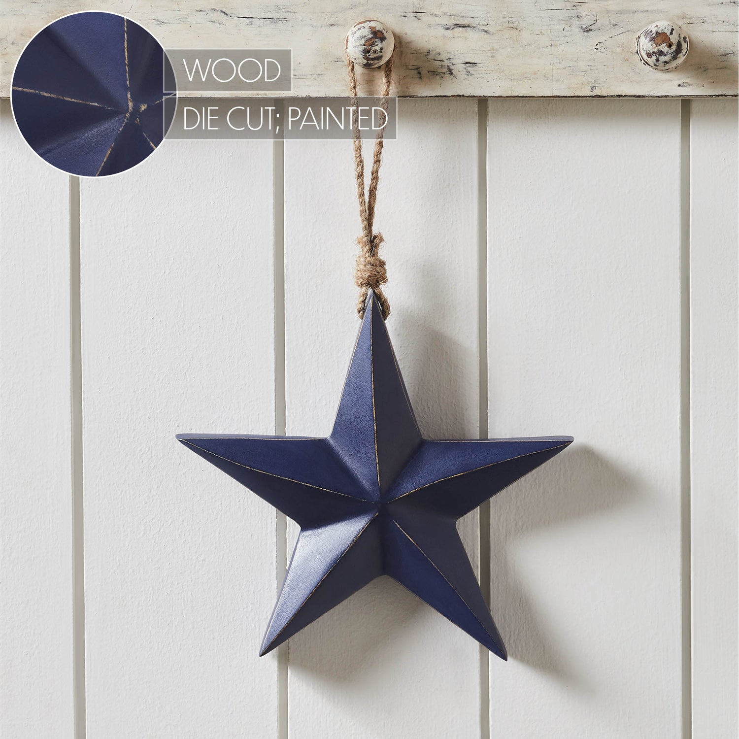 - Patriotic Wooden Star Ornament in Faded Blue: The VHC Brands Patriotic Wooden Star Ornament, sized at 8x8x1.5, is a captivating Independence Day decor piece. Crafted from tropical wood, this ornament features a charming faded blue finish for a nostalgic and Americana-inspired look.
