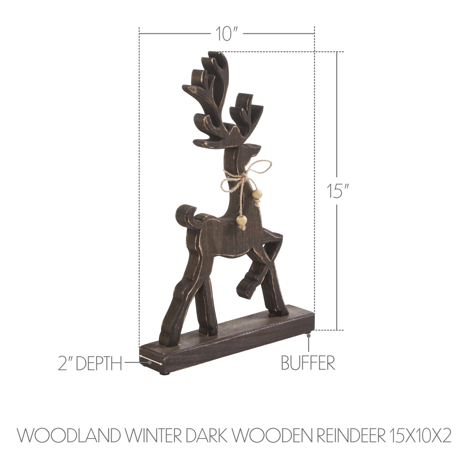 Bring timeless woodland charm to your holiday decor with the VHC Brands Woodland Winter Dark Wooden Reindeer. Measuring 7x11 inches, this vintage-style figurine is crafted from tropical wood and features a proud reindeer with its head held high. Finished in a deep brown tone with light tan distressing, it captures a rustic, timeworn look that fits beautifully into primitive and farmhouse-inspired holiday themes. A twine bow with wooden bead accents adds a simple, handcrafted touch, enhancing the reindeer's warm and natural appeal. Mounted on a sturdy wooden base, this decorative piece is perfect for display on mantels, tabletops, or shelves. Its solid color and classic silhouette make it a versatile accent that can stand alone or complement a larger seasonal arrangement. Ideal for placement in the bathroom, bedroom, dining room, entryway, kitchen, or living room, the Woodland Winter Dark Wooden Reindeer brings a peaceful, festive presence to your home. Built for lasting use and easy maintenance, simply wipe clean with a soft cloth to keep its rustic charm intact year after year. It's a meaningful addition to your holiday collection that celebrates the quiet beauty of winter.