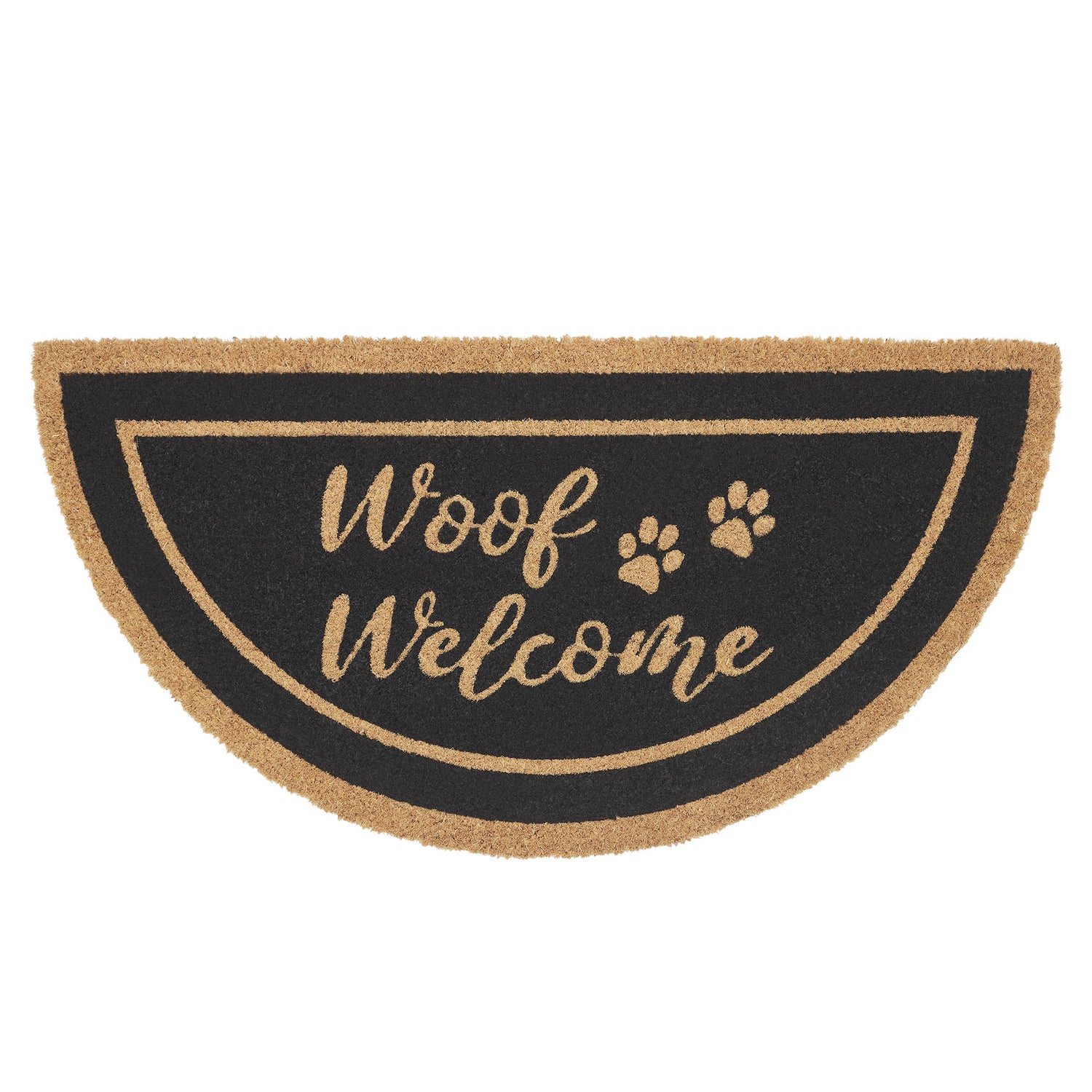 Welcome both two-legged and four-legged guests with the VHC Brands Woof Welcome Coir Welcome Rug Half Circle 16.5x33. This charming doormat features the playful greeting Woof alongside adorable pupper paw prints, all stenciled in natural tan against a deep black background. The half-circle design adds a unique, inviting touch to your entryway, making it perfect for dog lovers and rustic, country-inspired homes. Crafted from durable coir, this rug is designed to trap dirt and debris while offering a fun, welcoming accent to your home's entrance. The non-slip PVC backing ensures the rug stays securely in place, providing stability and safety in high-traffic areas. Its whimsical design, paired with the natural tan and deep black contrast, makes it a great addition to any pet-friendly household looking to add a cozy, country touch. For easy care, simply shake or vacuum to remove surface dirt. To prolong its bright colors and extend its life, keep the VHC Brands Woof Welcome Coir Welcome Rug in a sheltered entryway. Whether you're greeting friends or furry companions, this rug combines rustic charm with everyday functionality, making it a must-have for dog lovers and anyone who appreciates a warm, inviting space.
