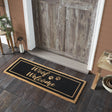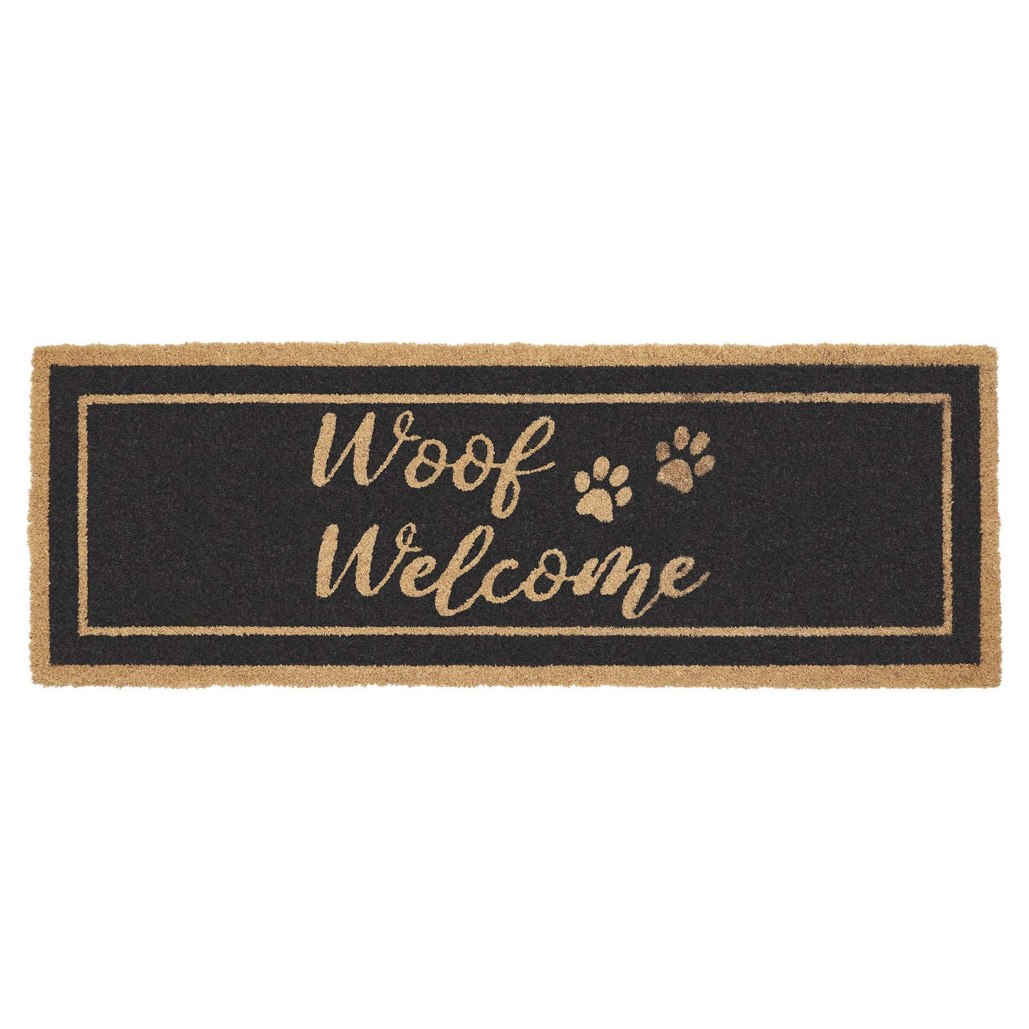 Welcome your furry friends and family with the delightful VHC Brands Woof Welcome Coir Welcome Rug Rect 17x48. This charming doormat features the playful word Woof along with adorable pupper paw prints, all stenciled in natural tan on a striking deep black base. The inviting design adds a fun, rustic touch to your entryway, making it a perfect fit for dog lovers and country-style homes. Crafted from durable coir, this rug is designed to effectively trap dirt and debris, keeping your entryway clean while providing a whimsical accent. Its rectangular shape fits snugly at your doorstep, and the non-slip PVC backing ensures the rug stays securely in place, providing stability and safety for both pets and guests. The combination of cute graphics and welcoming text creates a warm atmosphere that resonates with dog owners. For easy maintenance, simply shake or vacuum the rug to remove surface dirt. To prolong its vibrant colors and extend its life, keep the VHC Brands Woof Welcome Coir Welcome Rug in a sheltered entryway. Combining playful design with practical functionality, this rug is an essential addition for any home that values a warm and inviting entrance for both two-legged and four-legged guests.